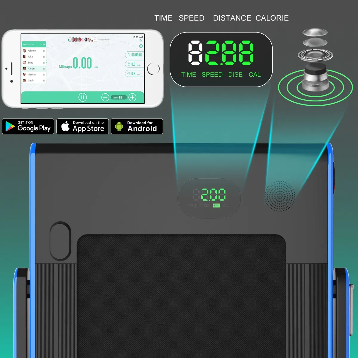 Bluetooth-luidspreker en led-display –  Tijd, snelheid, afstand en zelfs calorieën worden allemaal duidelijk weergegeven op het led-scherm. Dit helpt u uw voortgang en fysieke conditie in realtime te volgen. Dankzij de Bluetooth-functie maakt de loopband hardlopen niet meer saai omdat hij muziek kan afspelen.
