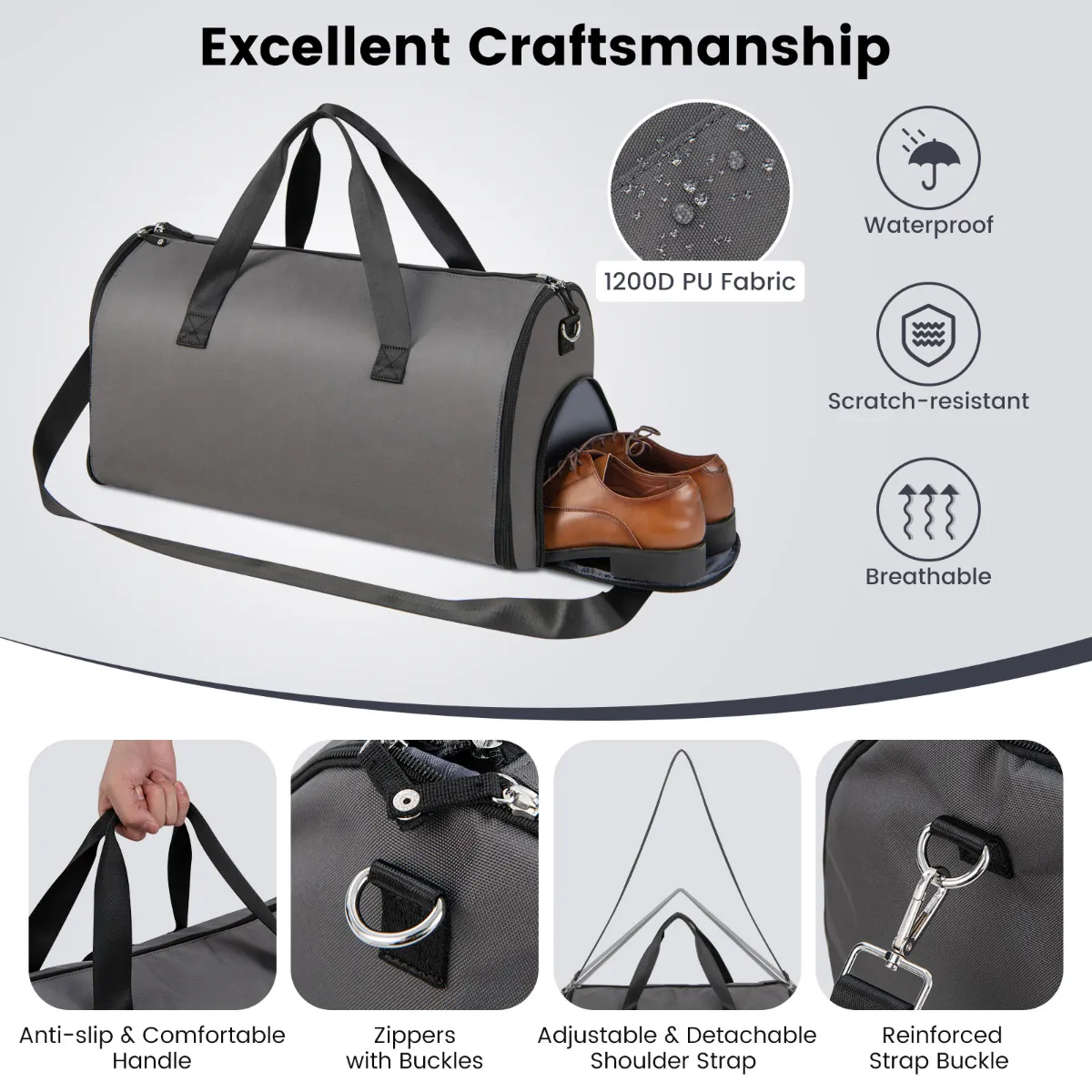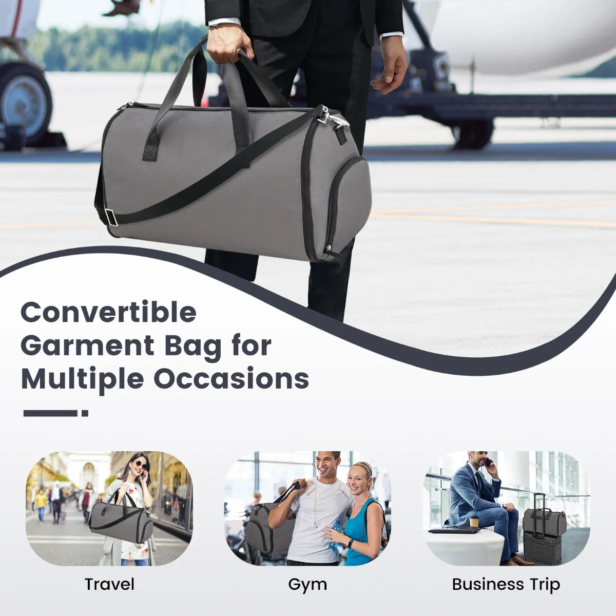 Gemakkelijk te dragen en geschikt voor vliegtuig: Je kunt de converteerbare kledingtas comfortabel op de arm, over de schouder of aan de stang van je koffer dragen. Als hij als handbagage wordt gebruikt, meet hij 55 cm x 27 cm x 31 cm, wat voldoet aan de eisen van de luchtvaartmaatschappijen, en je kunt hem in je bagagevak of onder je stoel opbergen.