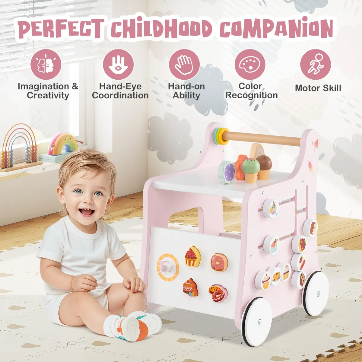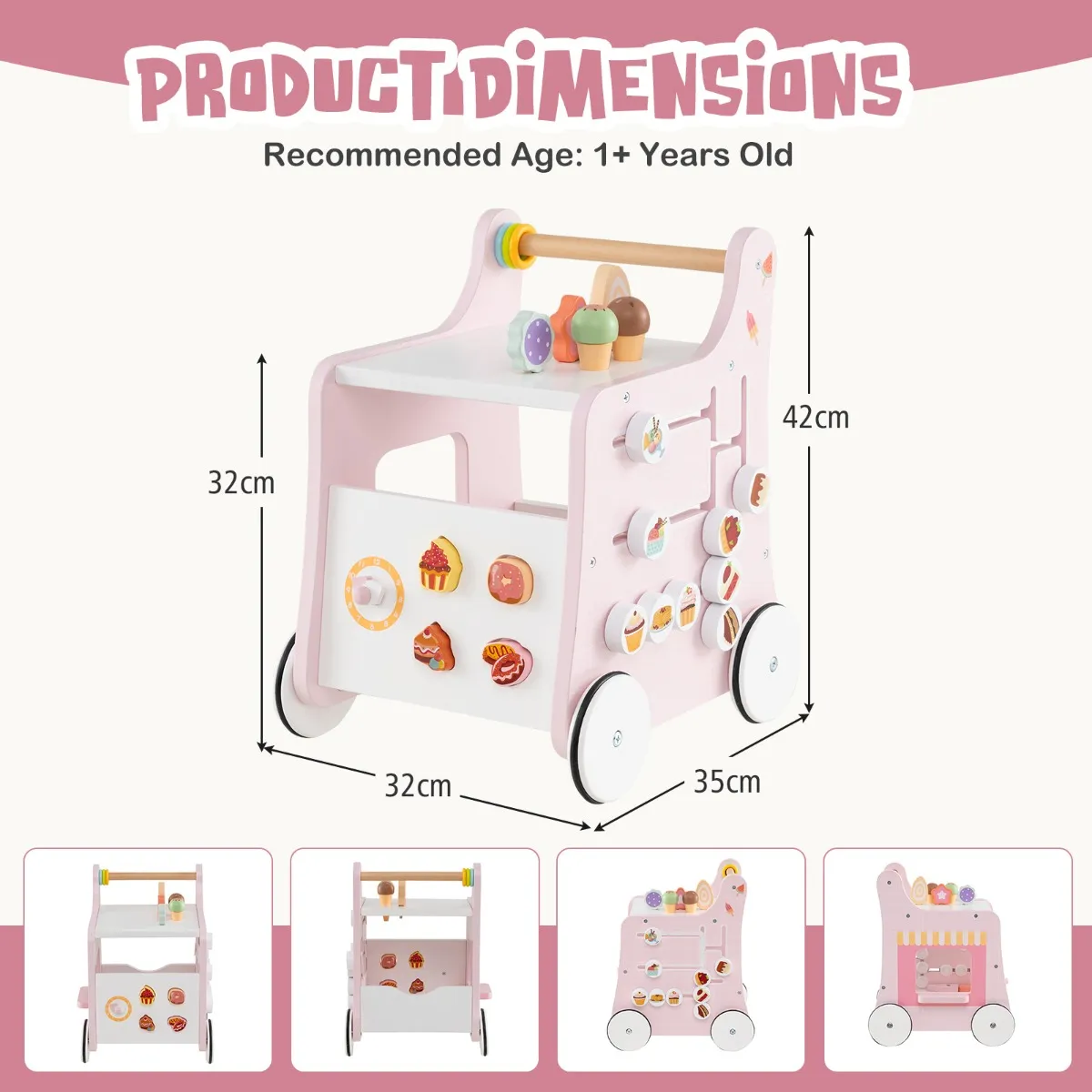 Deze multifunctionele loopwagen biedt je kleintje dynamische speeltijd. Een levendig venster aan de zijkant stimuleert fantasierijk rollenspel. Hij is ontworpen voor veiligheid en heeft gladde, afgeronde randen en is gemaakt van betrouwbaar MDF-materiaal. De grote wielen zijn bekleed met antislip, stil rubber. De comfortabele houten handgreep ligt gemakkelijk in de hand. Onder het speeloppervlak bevindt zich een ruime opbergruimte, ideaal voor het opbergen van speelgoed, wat de creativiteit, verbeelding, motoriek en hand-oogcoördinatie stimuleert bij kinderen van 1 jaar en ouder.