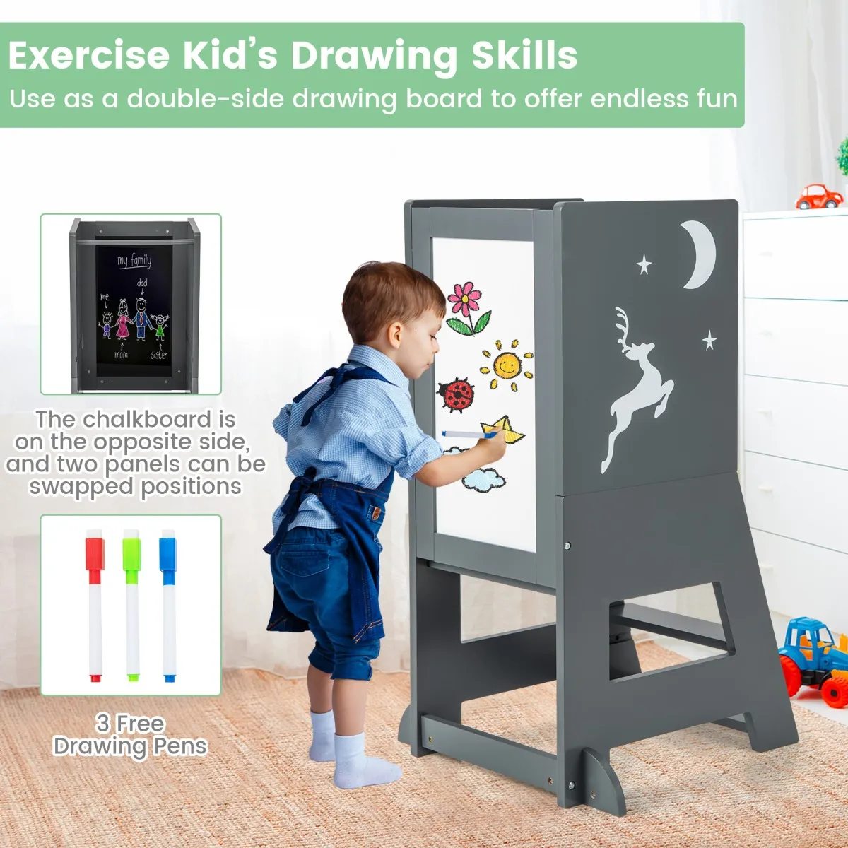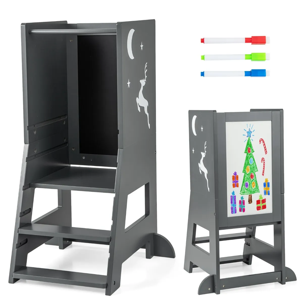 Oefen de tekenvaardigheden van kinderen : Met 3 meegeleverde stiften op waterbasis, een whiteboard en een schoolbord, stimuleert deze leertoren de creativiteit van je kind en helpt het zijn tekenvaardigheden te ontwikkelen. Bovendien ondersteunen de 2 borden een dubbelzijdige installatie.
