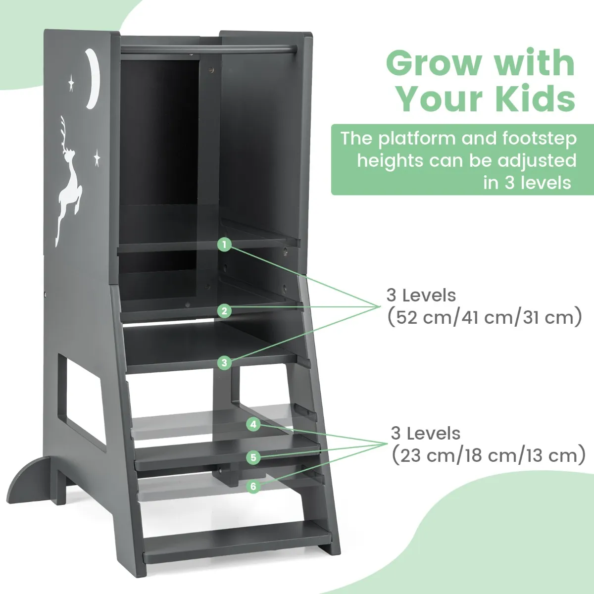 Verstelbaar opstapje en platform : Deze leertoren is ontworpen om met je kind mee te groeien. De verstelbare trede (23 cm/18 cm/13 cm vanaf de grond) en het brede mobiele platform (52 cm/41 cm/31 cm vanaf de grond) bieden verschillende hoogtes, zodat ze perfect passen bij kinderen van 1 tot 7 jaar.