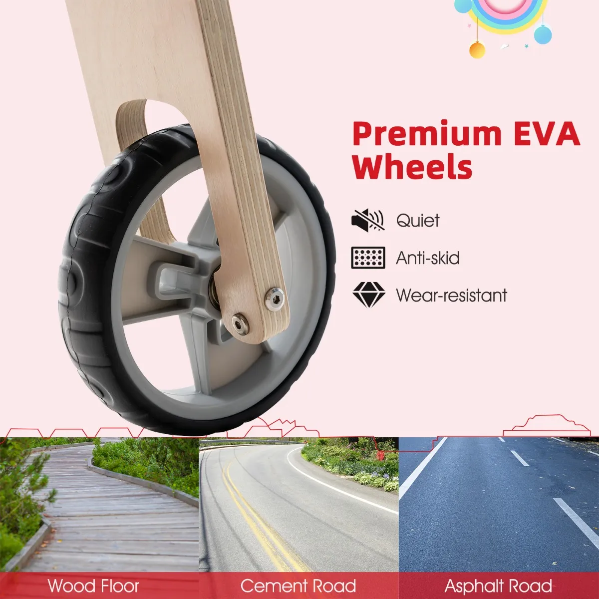 Met antislip stuur en hoogwaardige EVA-wielen kunnen je kinderen veilig en soepel op houten vloeren, cementstraten, asfaltwegen enz. rijden. Bovendien voorkomt een met 135 graden begrensd stuur dat het per ongeluk valt. En de stoel kan een gewicht van maximaal 50 kg dragen. Veilig houtmateriaal beschadigt de gezondheid van je kind niet en gladde randen voorkomen per ongeluk krassen. Onze kinderstep is de ideale keuze voor jou en je gezin. Hij kan je kleintjes blij maken en zijn evenwichtsvermogen en zelfvertrouwen verbeteren. Tijdens het rijden kunnen de kinderen zich ook fysiek fit houden.