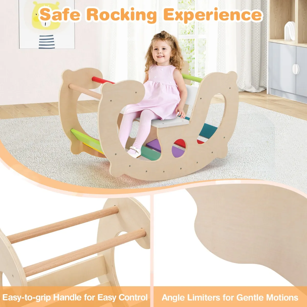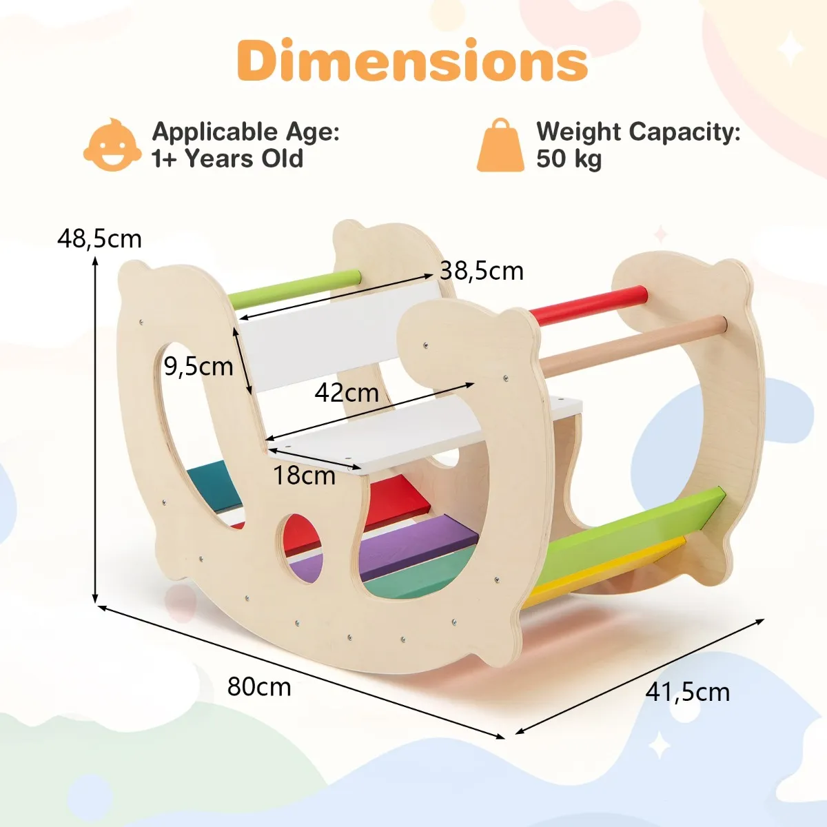 Als schommelpaard biedt het kinderen een leuke schommelervaring. Om de veiligheid tijdens het schommelen te garanderen, is het voorzien van begrensde schommelhoeken. Omgedraaid kan het speelgoed gebruikt worden als klimboog. Kinderen kunnen de beukenhouten sporten en planken vastgrijpen om op en neer te klimmen. Dit houten regenboogspeelgoed stimuleert het evenwichtsgevoel, de coördinatie en de fysieke kracht van kinderen tijdens het spelen. Ideaal voor speelkamers, woonkamers, kinderdagverblijven, speelparken of andere binnenspeelruimtes. Â