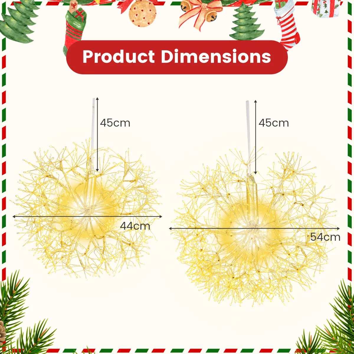Deze set van 2 paardebloem kerstverlichting heeft gouden accenten en 1488 warmwitte LED’s voor een warme, uitnodigende gloed. Met hun weerbestendige constructie en veelzijdige ophangmogelijkheden zijn ze perfect voor zowel buiten als binnen. Tover je huis of tuin moeiteloos om in een feestelijk landschap met een eenvoudige plug en hang installatie. Voeg een vleugje elegantie en warmte toe aan je feestelijke vieringen met deze weerbestendige lampen.