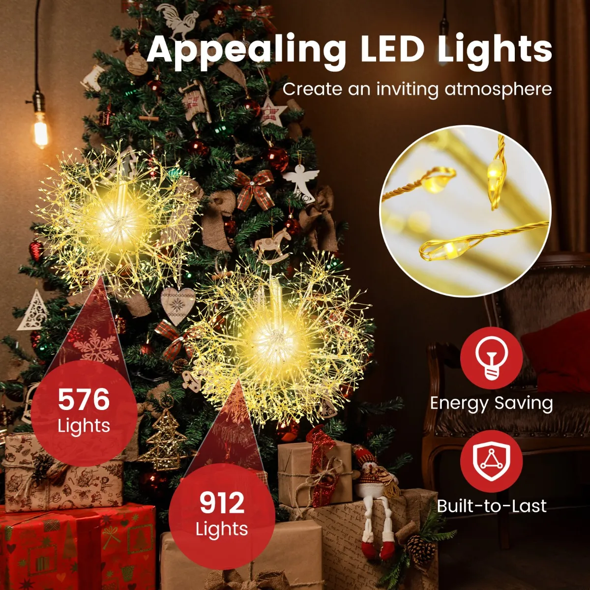 【Aantrekkelijke LED-lampjes】: Met 1.488 warmwitte LED’s stralen deze lampjes een zachte, uitnodigende gloed uit die de feestelijke sfeer verbetert. De warmwitte kleur creëert een warme sfeer, perfect voor bijeenkomsten en vieringen.