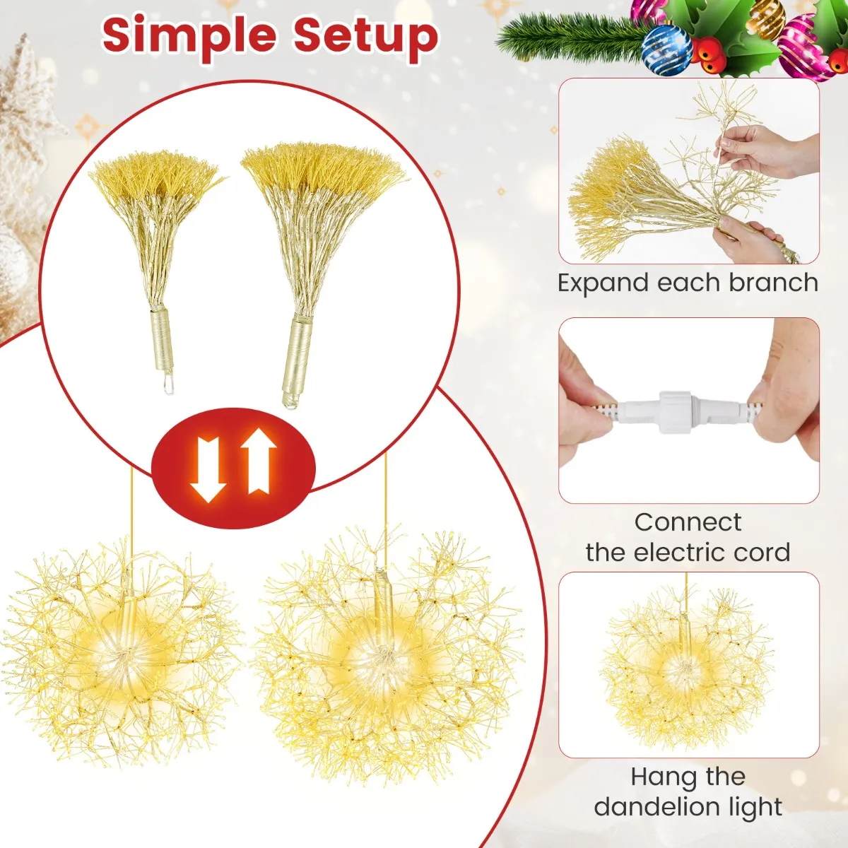 【In de vorm van een paardenbloem】: Elegant ontworpen met een gouden afwerking bieden deze hanglampen een grillige charme. Het ingewikkelde ontwerp bootst de delicate structuur van een paardenbloem na en voegt een vleugje natuurlijke schoonheid toe aan je feestelijke inrichting.