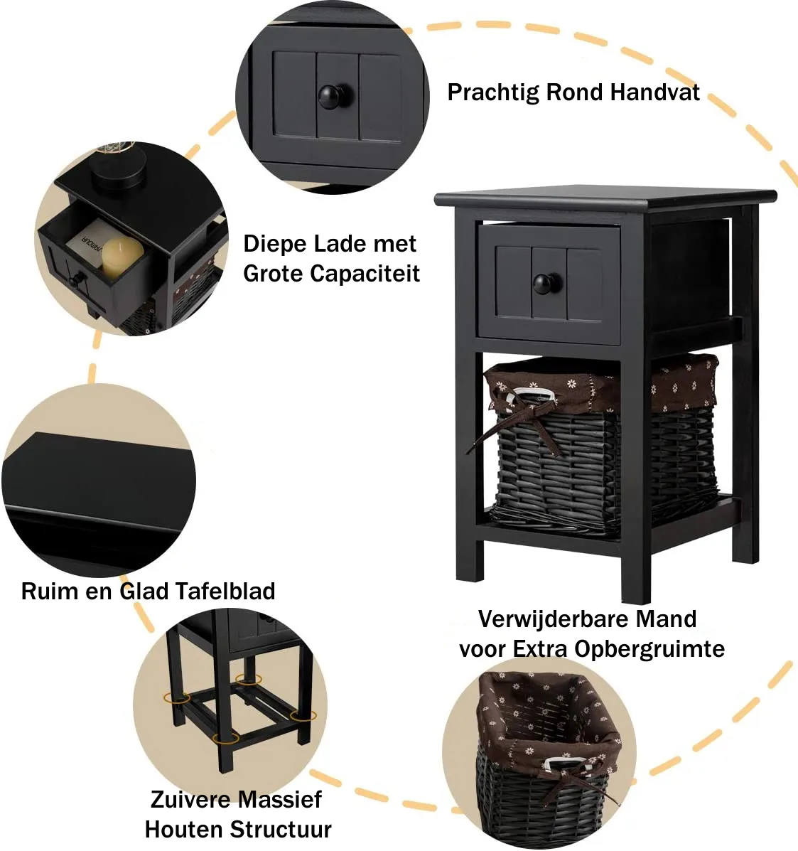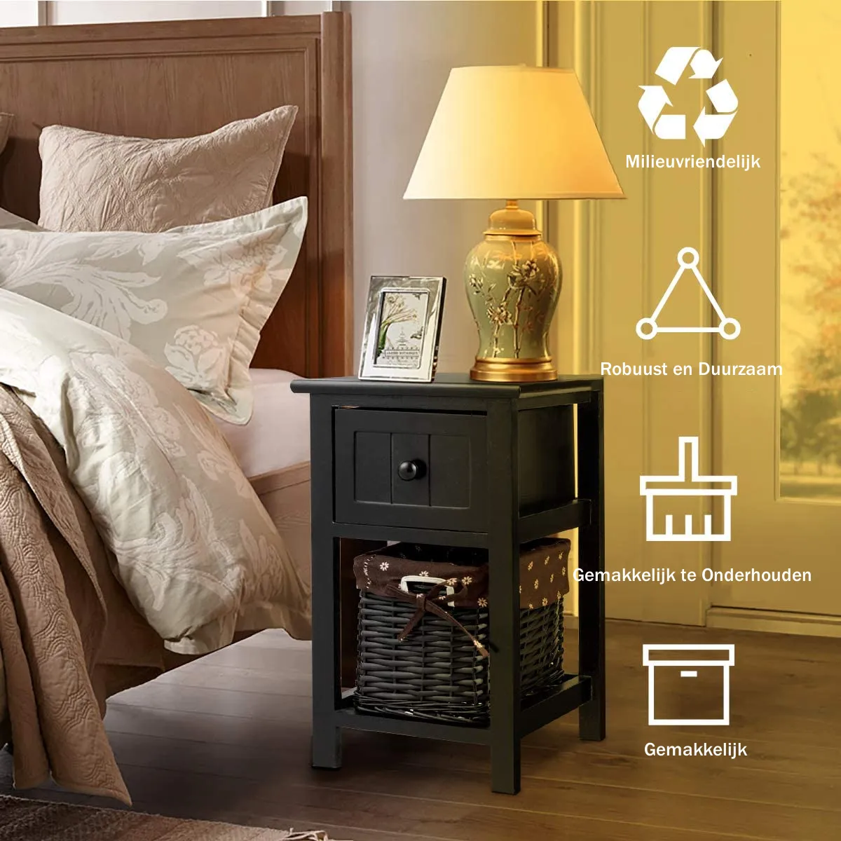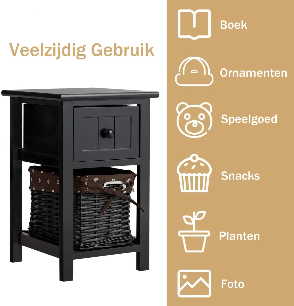 【Ruime opbergruimte】Dit houten nachtkastje met 2 verdiepingen is uitgerust met 1 lade en 1 mandlades en helpt u om uw nachtbenodigdheden bij de hand te houden. Een schattige rieten mand op de onderste plank biedt extra opbergruimte.