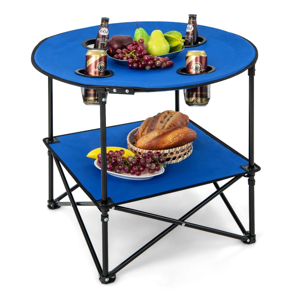 Onze 2-laags kampeertafel is eenvoudig op te zetten en af te breken. Er wordt een draagtas meegeleverd, ideaal voor buitenactiviteiten. Het is ontworpen met 2 niveaus. Het tafelblad is handig om te eten of kaarten, en het tweede niveau kunt u gebruiken om uw benodigdheden op te bergen. De beker is voorzien van 4 gaashouders om uw drankjes stevig vast te houden en omvallen te voorkomen. Het is gemaakt van waterdicht Oxford-materiaal en een stevig metalen frame, wat zorgt voor duurzaam gebruik buitenshuis.