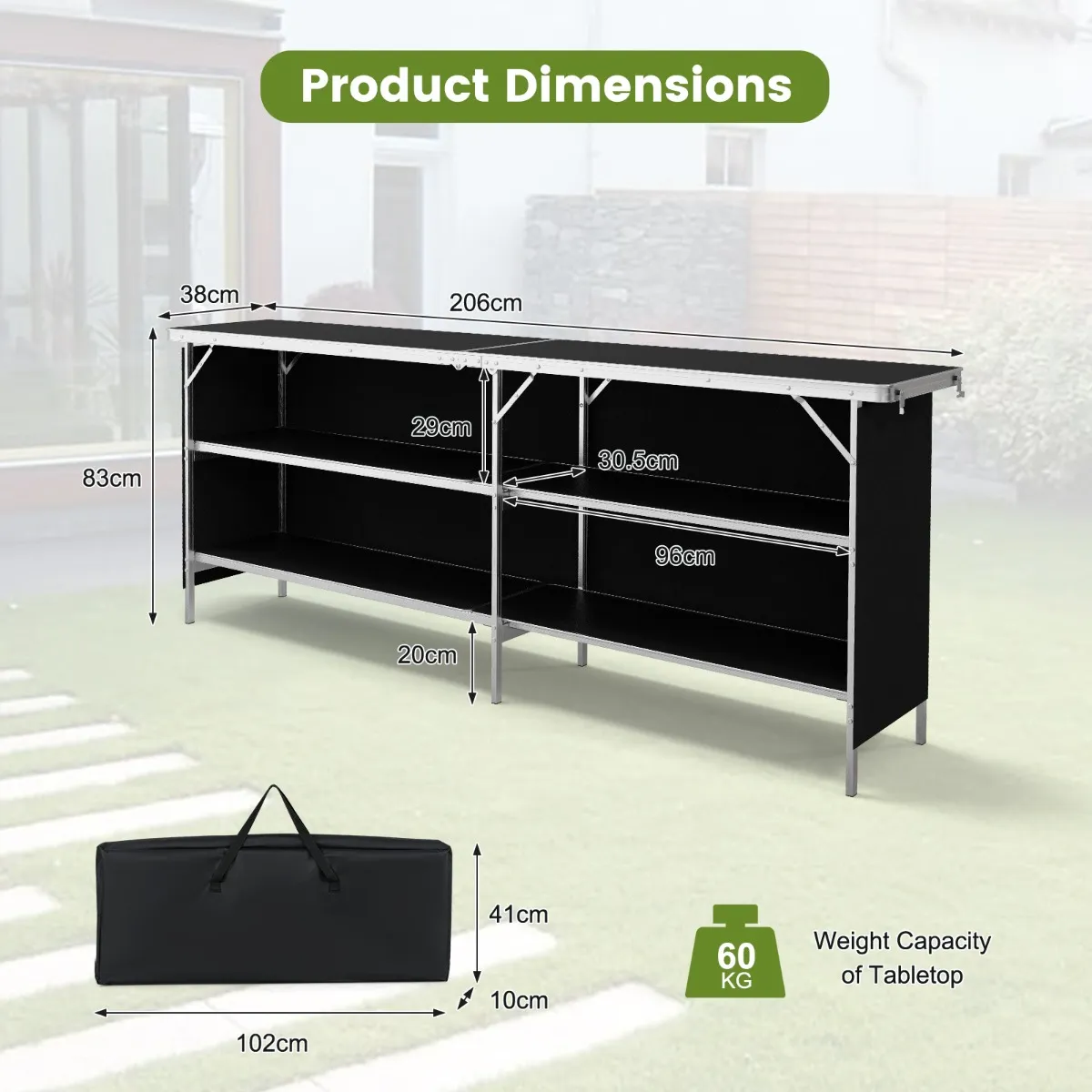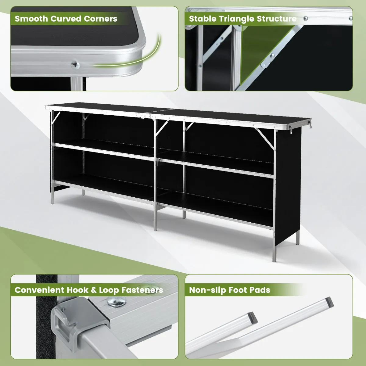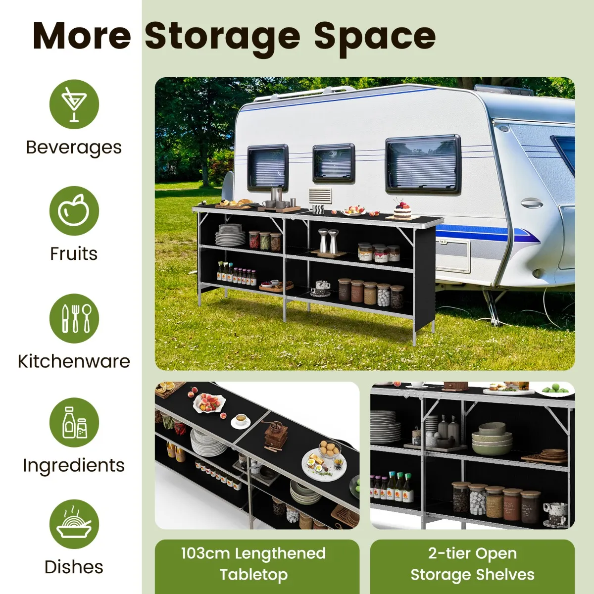 【Uitgebreide opbergruimte】De grote campingtafel heeft een 206 cm lang tafelblad en opbergplanken op 2 niveaus, waardoor er genoeg ruimte is om drankjes, fruit, ingrediënten en gerechten op te bergen. Je kunt alles wat je nodig hebt voor een reis of kampeertrip organiseren.