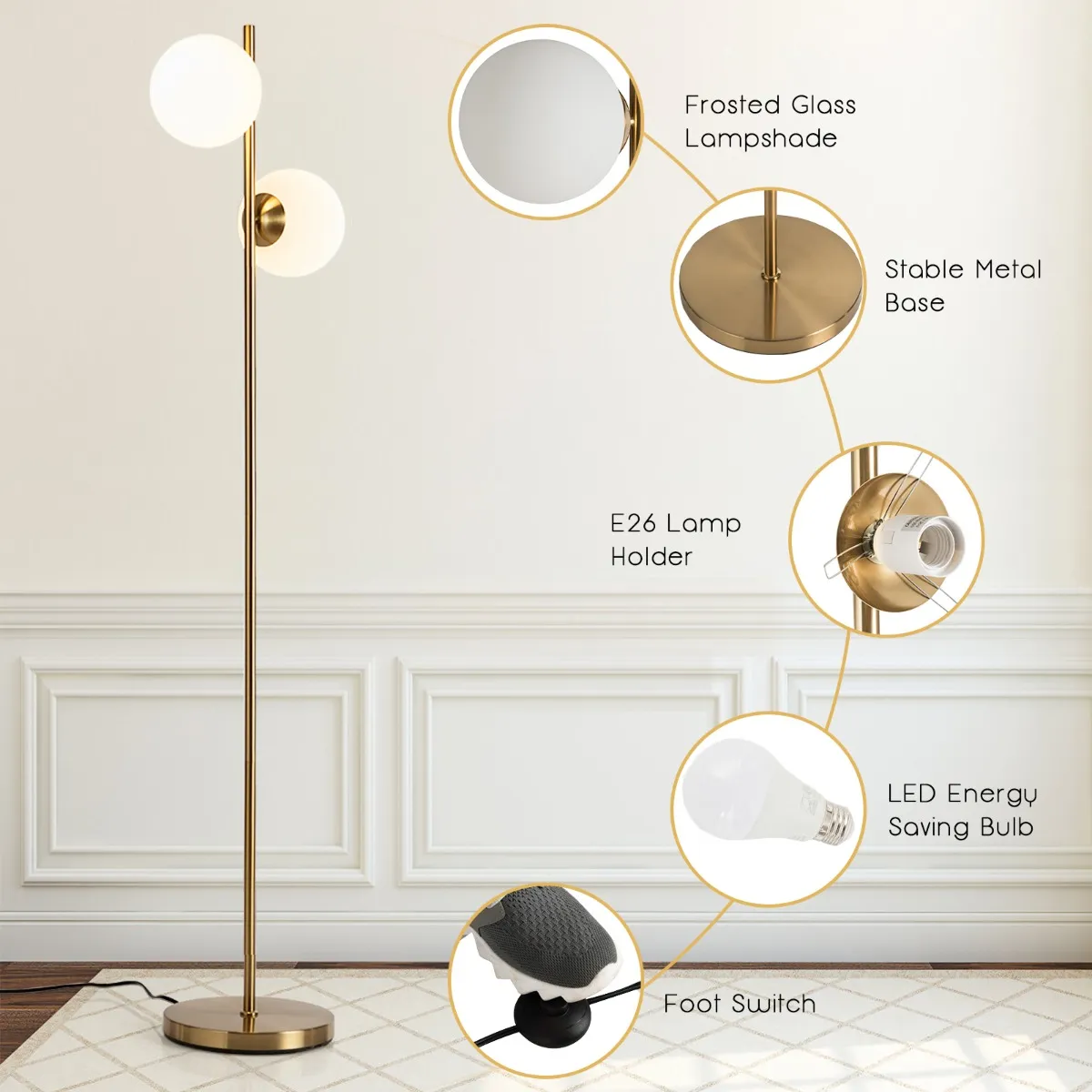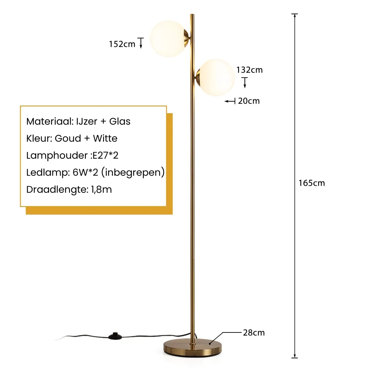 【Prachtige decoratie voor uw ruimte】 Deze vloerlamp is een opvallend en decoratief stuk. De stijlvolle gouden staaf wordt aangevuld met twee hoogwaardige bollen van melkglas, die ongetwijfeld een gevoel van stijl en kunst aan uw huis geven. Het warme licht en het elegante ontwerp passen perfect bij elk interieur, zoals Mid-Century, Vintage, Modern en meer.