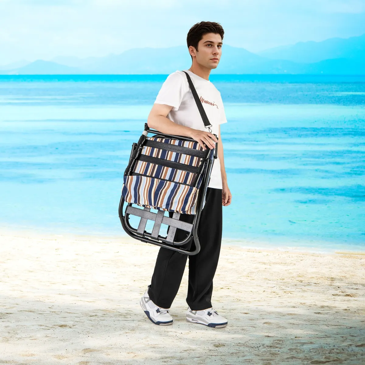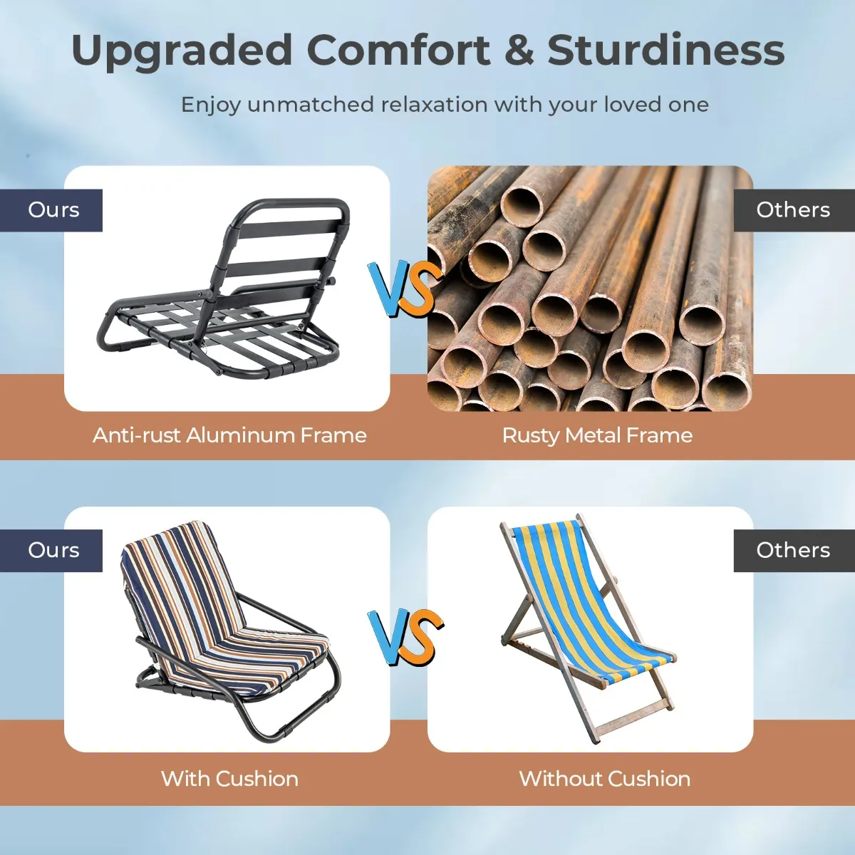 Stevige constructie:Â Deze draagbare strandstoelen zijn speciaal vervaardigd met een laag grondontwerp en zorgen voor superieure stabiliteit op elk oppervlak, van zandstranden tot grasvelden. De versterkte driehoekige structuren zorgen voor extra stabiliteit.