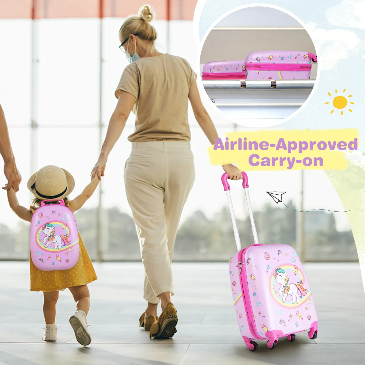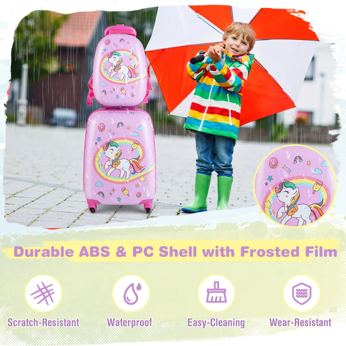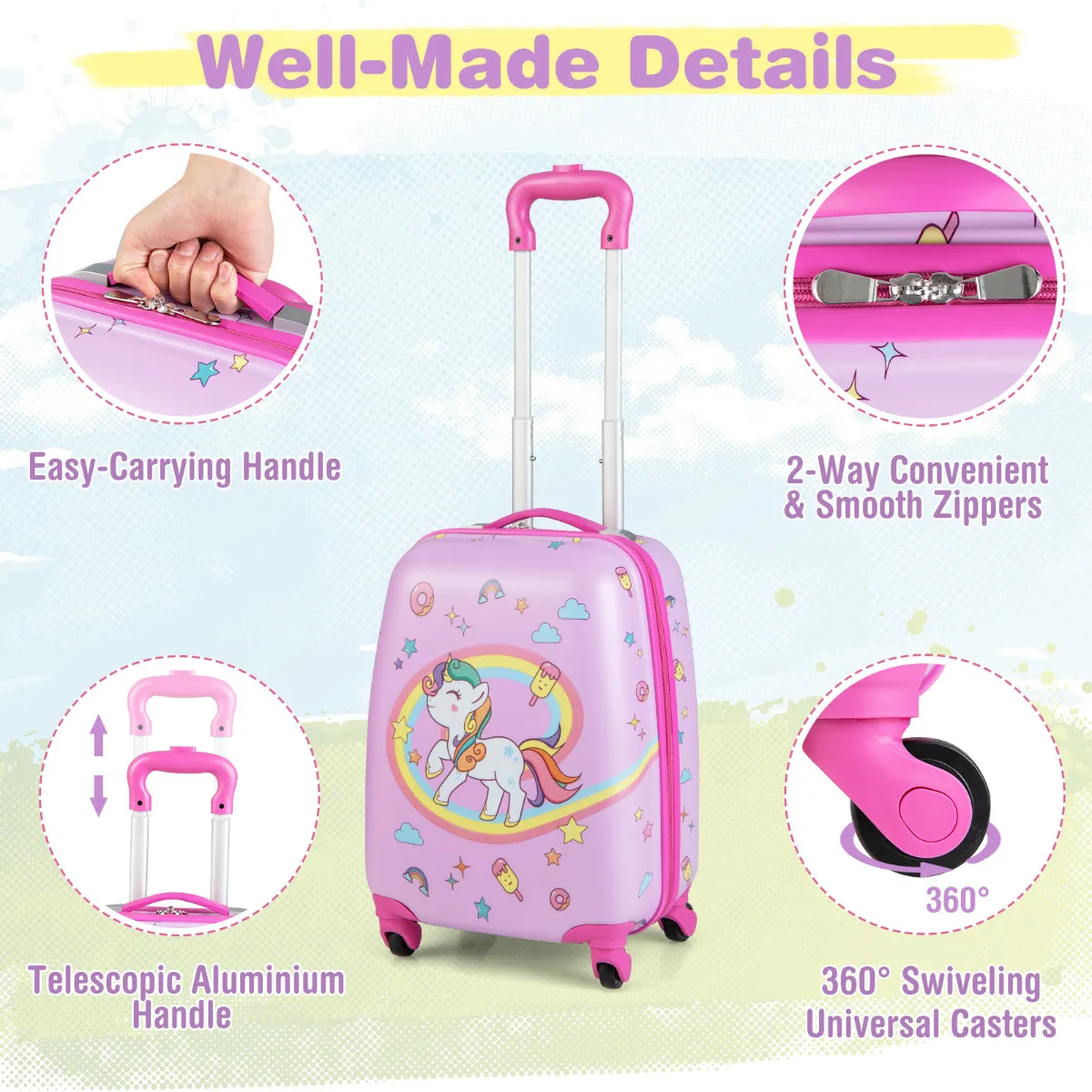 【2 stuks kindertrolley bagage set】 De kindertrolley bagage set bestaat uit een hard-shell rolkoffer en een rugzak, perfect formaat om op te bergen in het overhead compartiment of onder de vliegtuigstoel. Weegt slechts 2,5kg/2kg, licht genoeg om door kinderen getrokken of geduwd te worden.