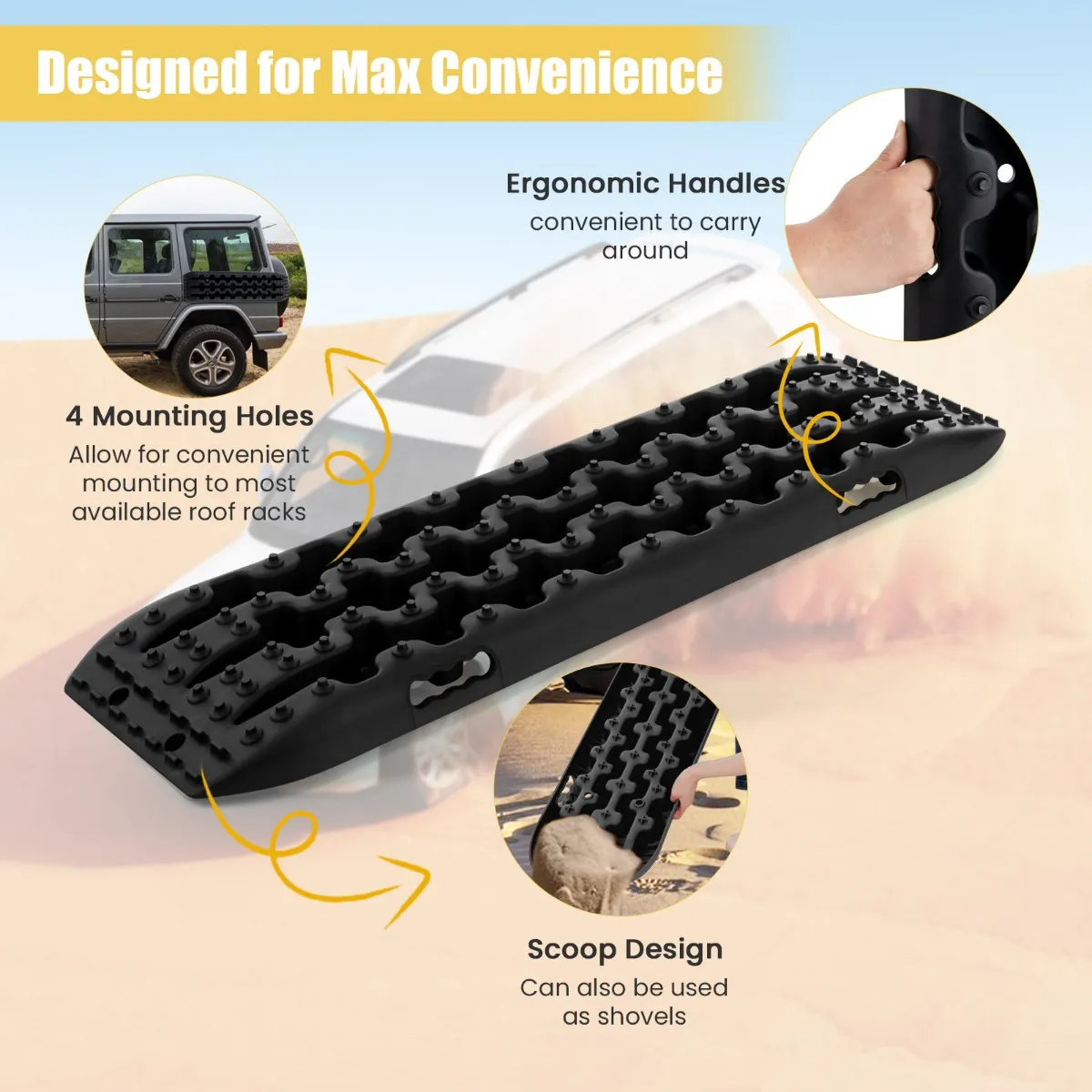 Het pakket bevat 2 offroad-tractieplanken. Elke bergingsrail bestaat uit robuust, maar licht nylonmateriaal en kan tot 10 ton dragen en extreme temperaturen van -30 °C tot 60 °C weerstaan. Deze zeer belastbare tractiemat is bovendien super flexibel, buigzaam en breekt niet zo gemakkelijk. Beide zijden van de bandenladder zijn voorzien van noppen en tanden om de wrijving tussen banden en grond te verhogen en zo doordraaien van de voertuigbanden te voorkomen.
