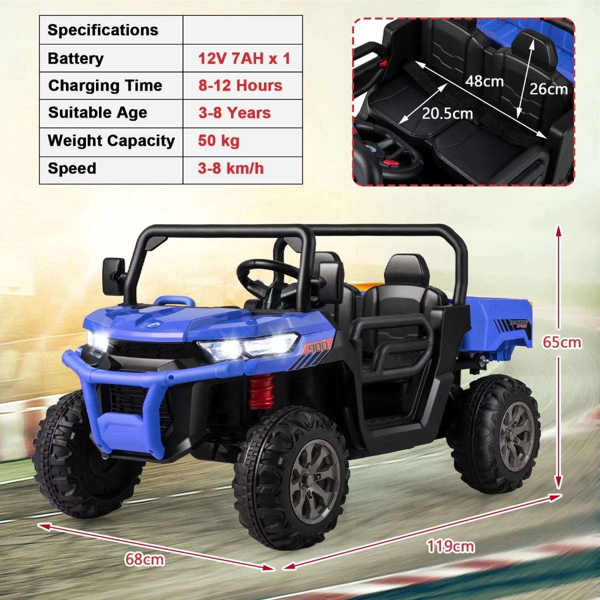 Krachtige terrein prestaties: 4 extra brede, slijtvaste wielen zijn allemaal voorzien van veervering, waardoor de kiepwagen sterkere terrein prestaties levert. Bovendien garanderen twee krachtige motoren en een oplaadbare 12V-accu meer en langer rijplezier. Kinderen kunnen met een terreinwagen soepel over asfaltwegen, cementwegen enz. rijden.