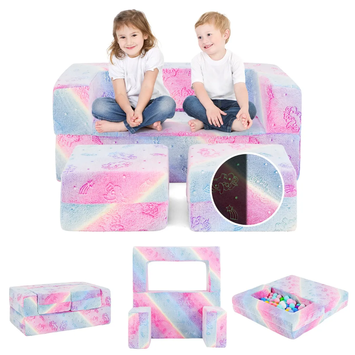 Onze speelbank voor kinderen is voorzien van leuke patronen die oplichten in het donker. Deze zachte flanellen bankblokken zijn gemaakt voor comfort en veiligheid en zijn gevuld met ondersteunend schuim. Hierdoor zijn ze de perfecte stoel voor uw kleintjes. Dankzij de afneembare, machinewasbare hoes is het schoonmaken eenvoudig, waardoor u tijd bespaart. Deze modulaire bank kan in allerlei vormen worden omgezet, zoals een ballenbak, een verstopplek of een poppentheater. Ideaal voor kinderen vanaf 3 jaar.