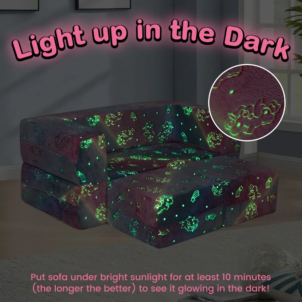 【Lichtgevend flanel】: Het zachte flanellen oppervlak van deze kinderbank heeft lichtgevende patronen. Stel het gewoon minstens 10 minuten bloot aan daglicht. Kinderen kunnen dan zien hoe schattige patronen de duisternis verlichten en bedtijd veranderen in een dromerig, onverschrokken avontuur.