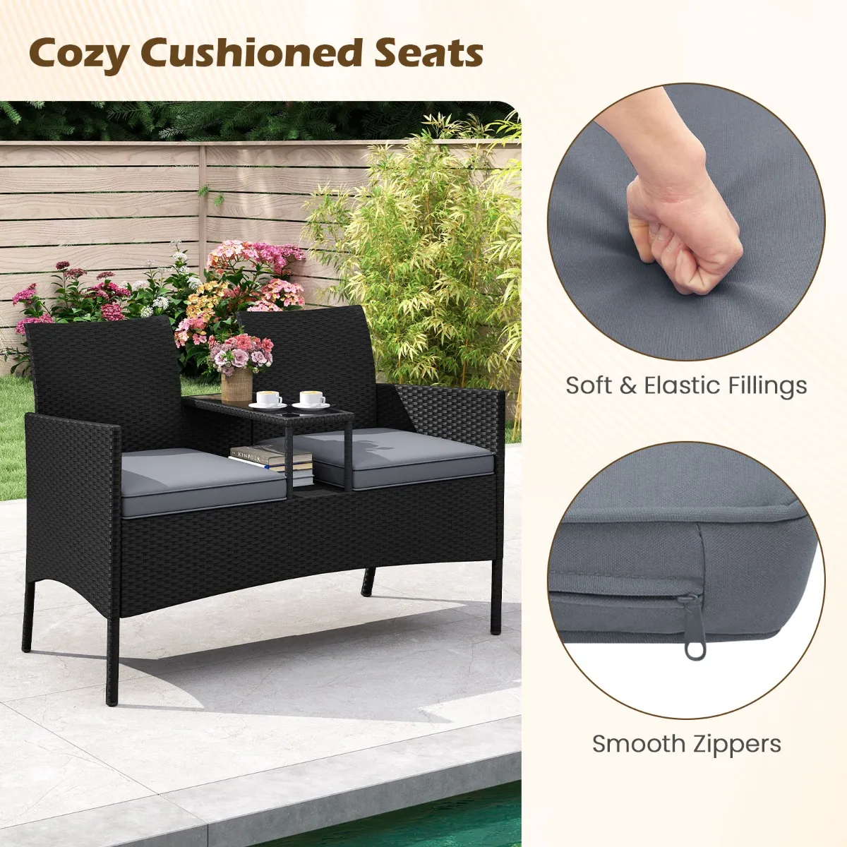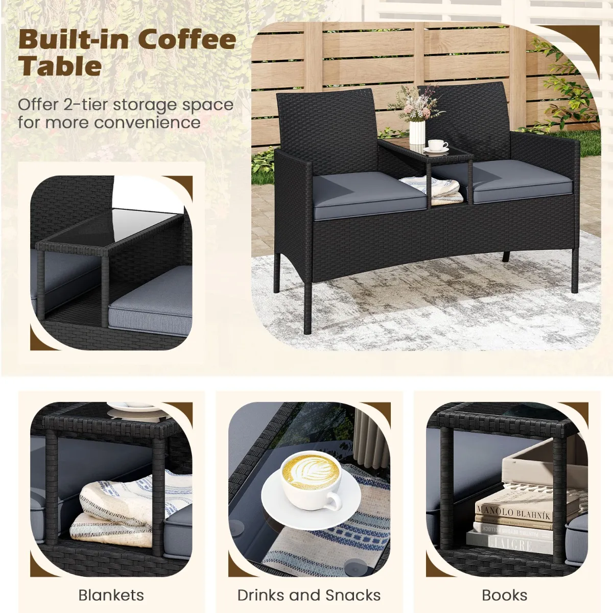 【Ingebouwde koffietafel】: Met een ingebouwde koffietafel in het midden met een blad van gehard glas biedt deze buitenbank gemak en raffinement. De opbergruimte op 2 niveaus is perfect voor het plaatsen van drankjes, snacks of boeken.