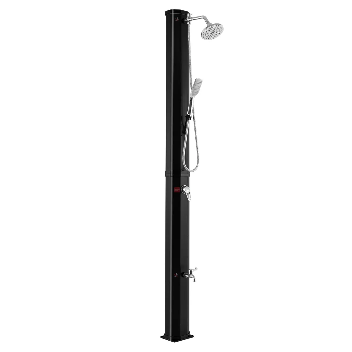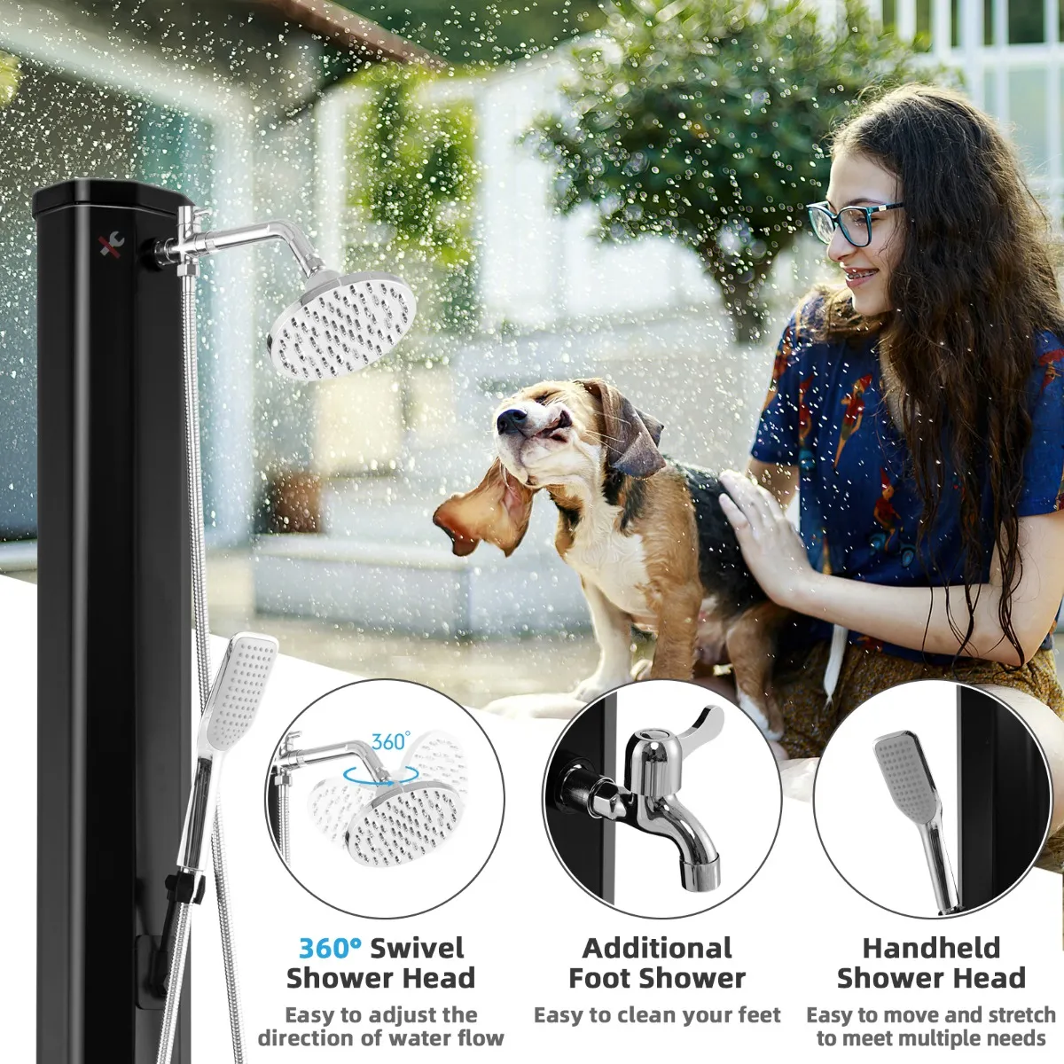 Onze zonne-energie verwarmde douche is ideaal voor het verwarmen van water douche buiten, die wordt aangedreven door zonne-energie en vereist geen elektriciteit. Het kan 35 L water bevatten en de watertemperatuur verhogen tot 60 °C, zodat alle gezinsleden kunnen genieten van een comfortabele buitendouche. Bovendien kunnen de temperatuur en de waterdruk eenvoudig worden aangepast door de kraan te draaien, zodat u hem kunt aanpassen voor meer comfort. Met een aansluiting voor de watertoevoer en een massief messing 1,9 cm kan de zonnedouche gemakkelijk worden aangesloten op een standaard tuinslang of een G1/2 waterslang. Bovendien, met een 360° draaibare douchekop, een flexibele douchekop en een voetdouche, kan het voldoen aan uw vele behoeften. Of u nu geniet van een verkoelende douche op warme zomerdagen, een lekkere douche neemt na het zwemmen, of uw voeten wast op het strand, het kan uw perfecte keuze zijn. Bovendien raden wij aan om het op cement of andere solide buitenoppervlakken te monteren met 4 bevestigingsschroeven voor meer veiligheid en stabiliteit.