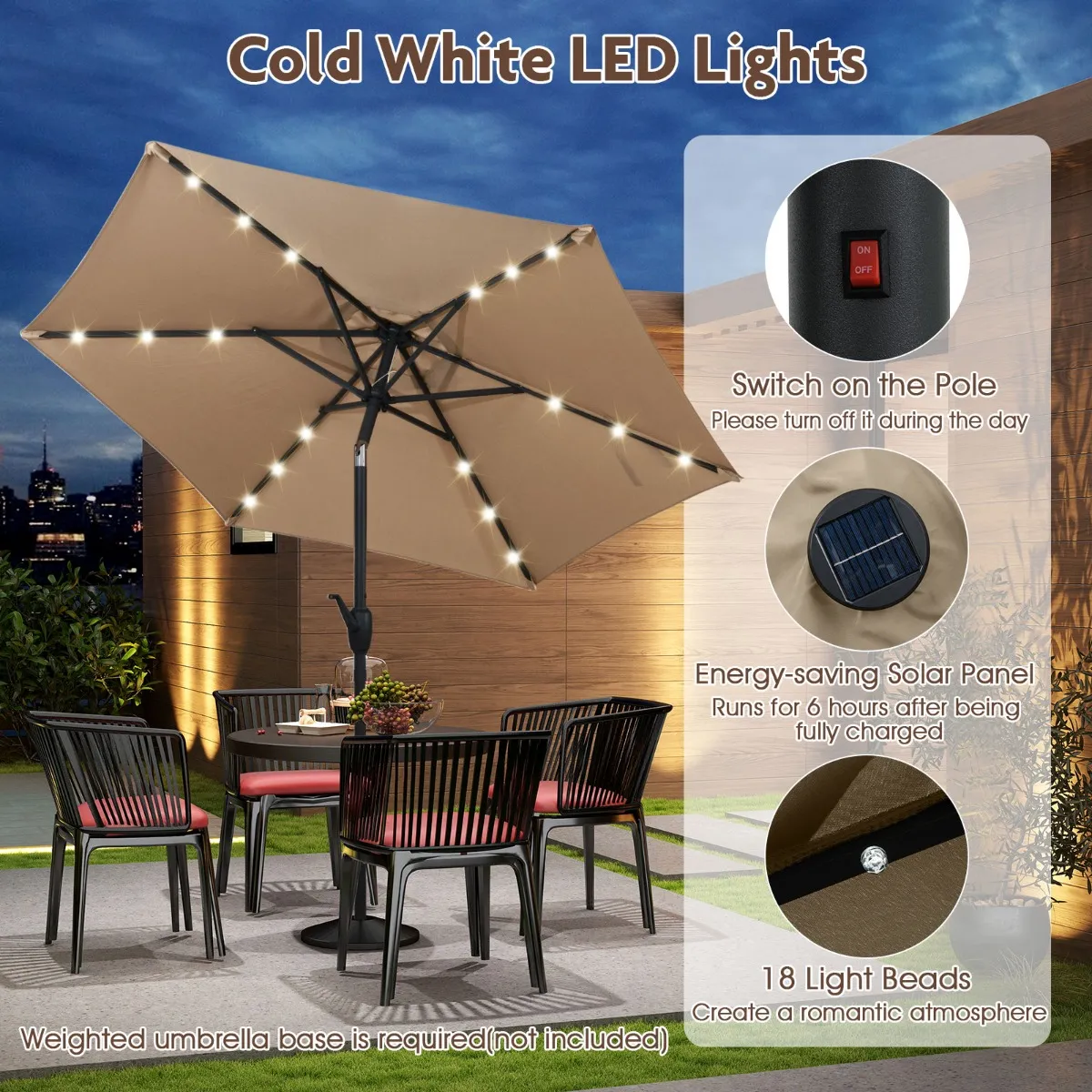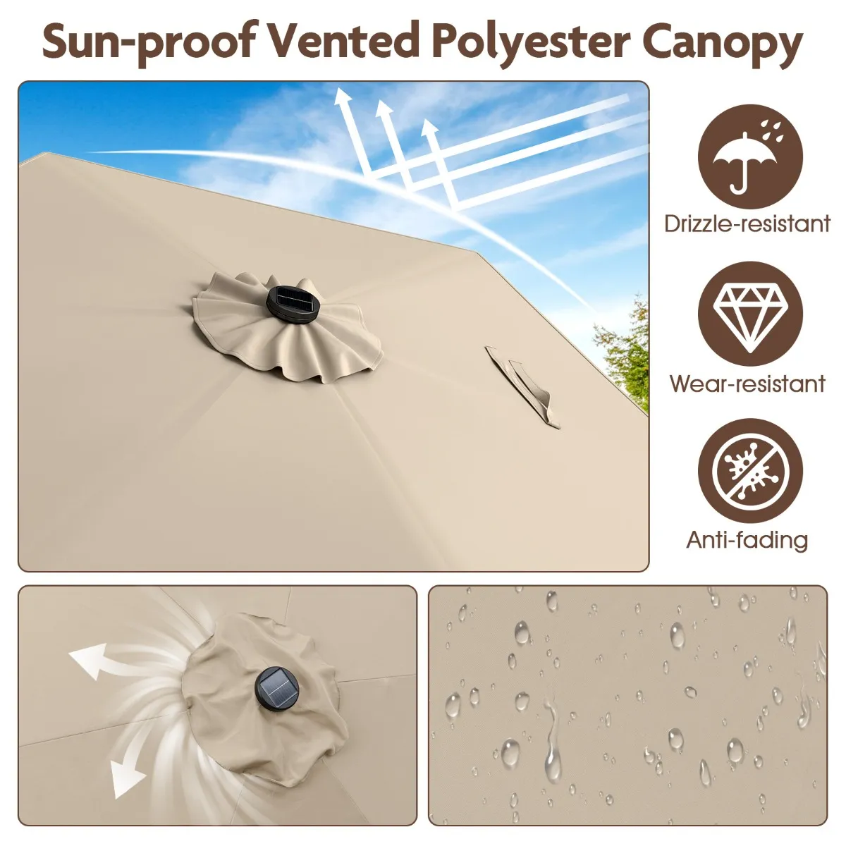 【Energiezuinig verlichtingssysteem】: Met 18 LED’s rond de baleinen verlicht deze parasol je avonden met een warme gloed. Het zonnepaneel geeft tot 6 uur verlichting na een volledige lading. Schakel de verlichting overdag uit voor langere verlichting.