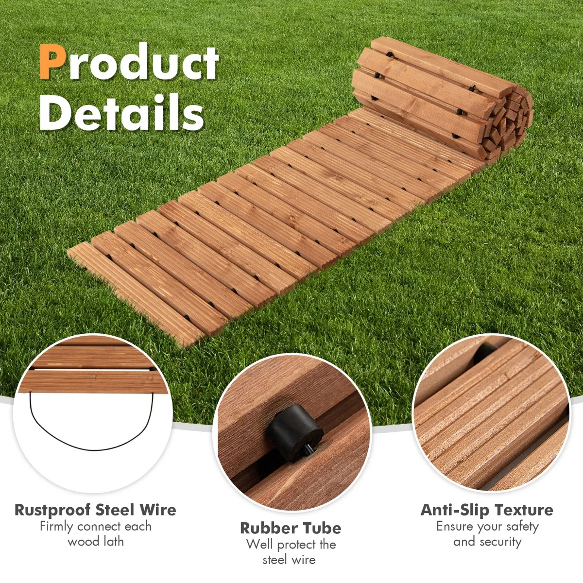 Versterkte constructie : De houten latten zijn stevig met elkaar verbonden door staaldraden, die goed gecoat zijn om roestvorming tegen te gaan. Bovendien beschermt de rubberen buis die de draad tussen elke houten lamel bedekt, de staaldraad binnenin. En de antisliptextuur op het oppervlak van het pad zorgt voor je veiligheid.