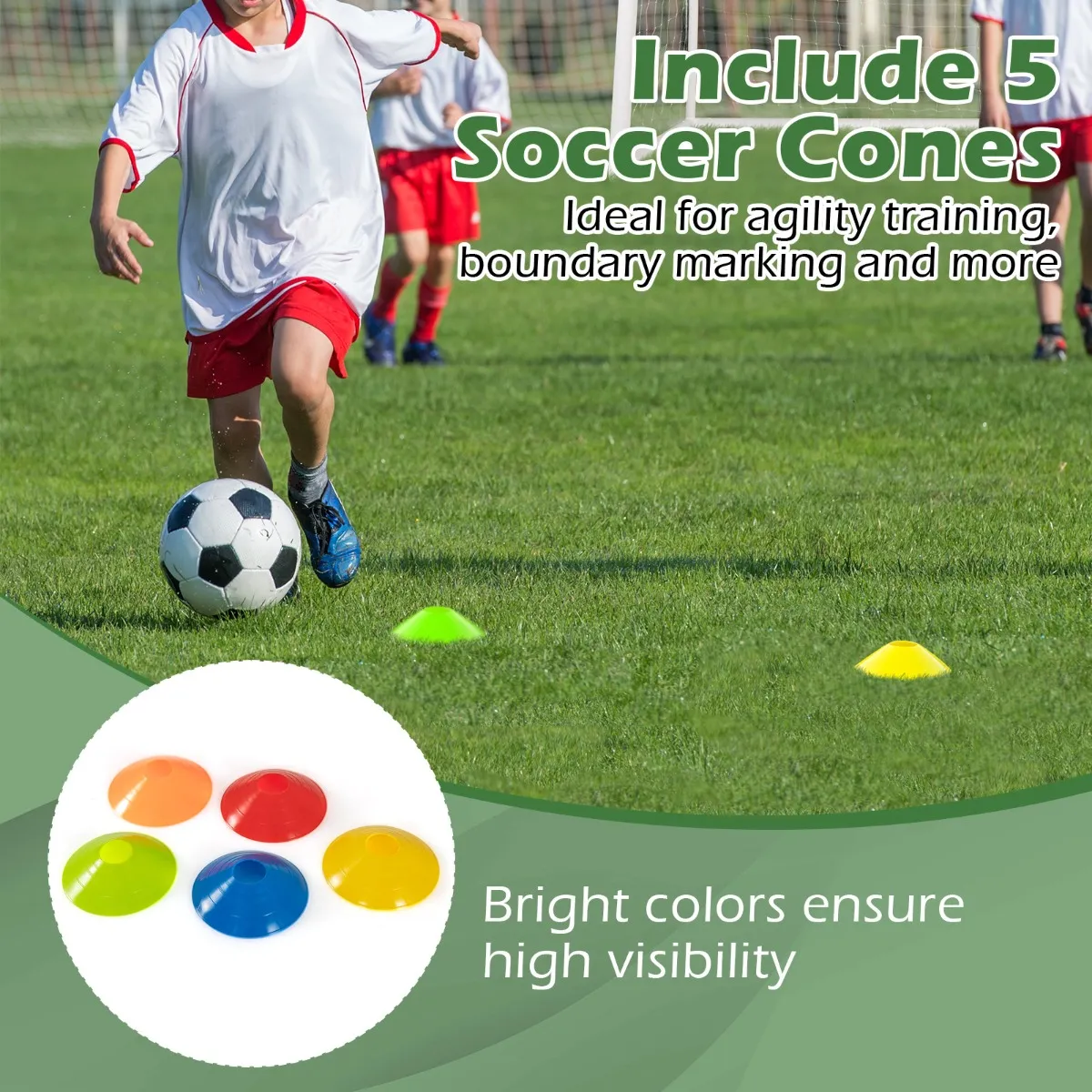【Inbegrepen accessoires】Je kunt 6 grondpinnen gebruiken om het doelframe stevig op zijn plaats te houden, waardoor stabiliteit tijdens intensieve gamesessies wordt gegarandeerd. In de verpakking zitten ook 5 voetbalkegels. Hun heldere kleuren bieden een hoge zichtbaarheid.