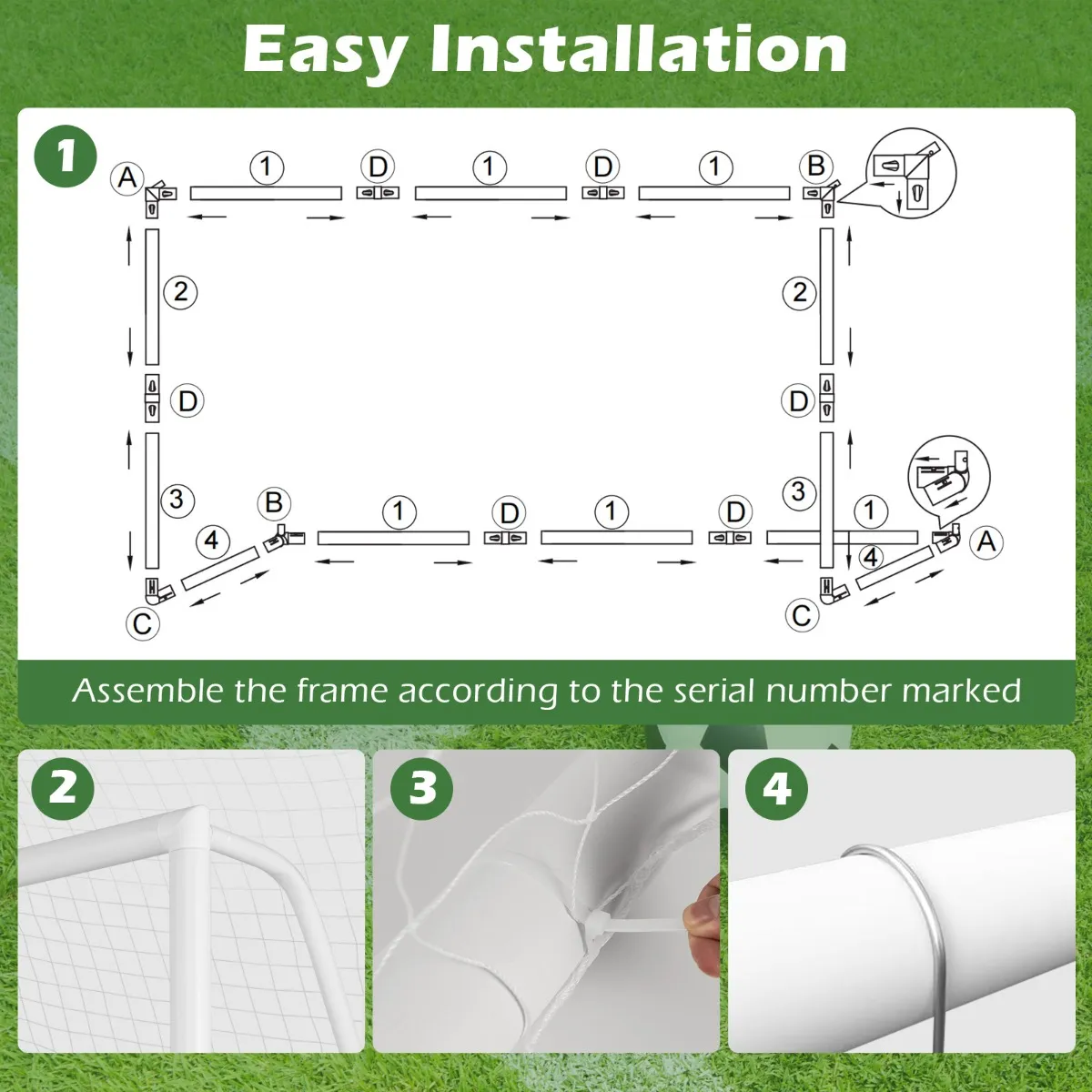 【Eenvoudige installatie】Het frame is eenvoudig te monteren met behulp van het meegeleverde serienummer en eenvoudig te volgen instructies. Dit voetbalframe is geschikt voor verschillende scenario’s, zoals speeltuinen, achtertuinen, parken en stranden.