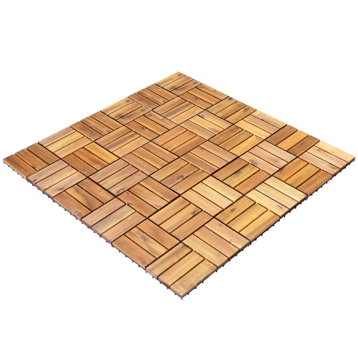 Deze tegels zijn voldoende om een ​​vloeroppervlak van 24300 cm² op uw terras, patio of binnenruimtes te bedekken. Je kunt er een paar sporen of matten mee bestraten. Vergrendelingsmechanismen zorgen ervoor dat u zonder gereedschap achteraf kunt inbouwen. U kunt enkele inkepingen en aanpassingen aan de tegels aanbrengen, zodat deze bij de vorm van uw vloer passen. En dankzij de kunststof matten beschadigen deze tegels je oude vloer niet. En dankzij de voorgeoliede acaciastammen heeft hij het echte effect van hardhouten vloeren, maar tegen lagere kosten. Bovendien gaat het buiten langer mee als u deze tegels eens in de 2-3 maanden oliet.