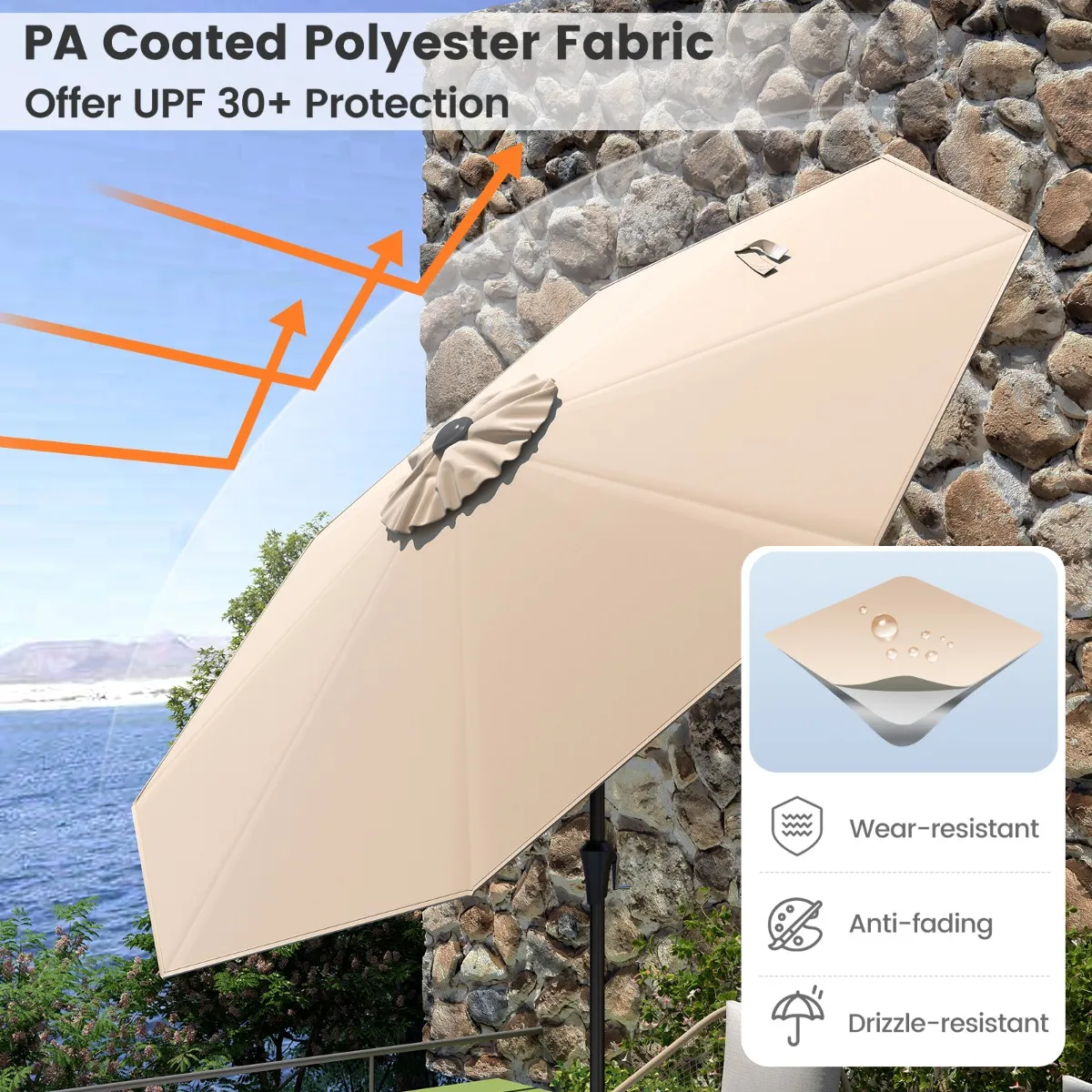 Eenvoudige kantelverstelling: De 270 cm grote tuinparasol is uitgerust met een kantelmechanisme dat met een druk op de knop kan worden bediend. Hiermee kunt u de parasol eenvoudig tot 35° kantelen en de hele dag door genieten van optimale schaduw, zonder de parasol te hoeven verplaatsen.
