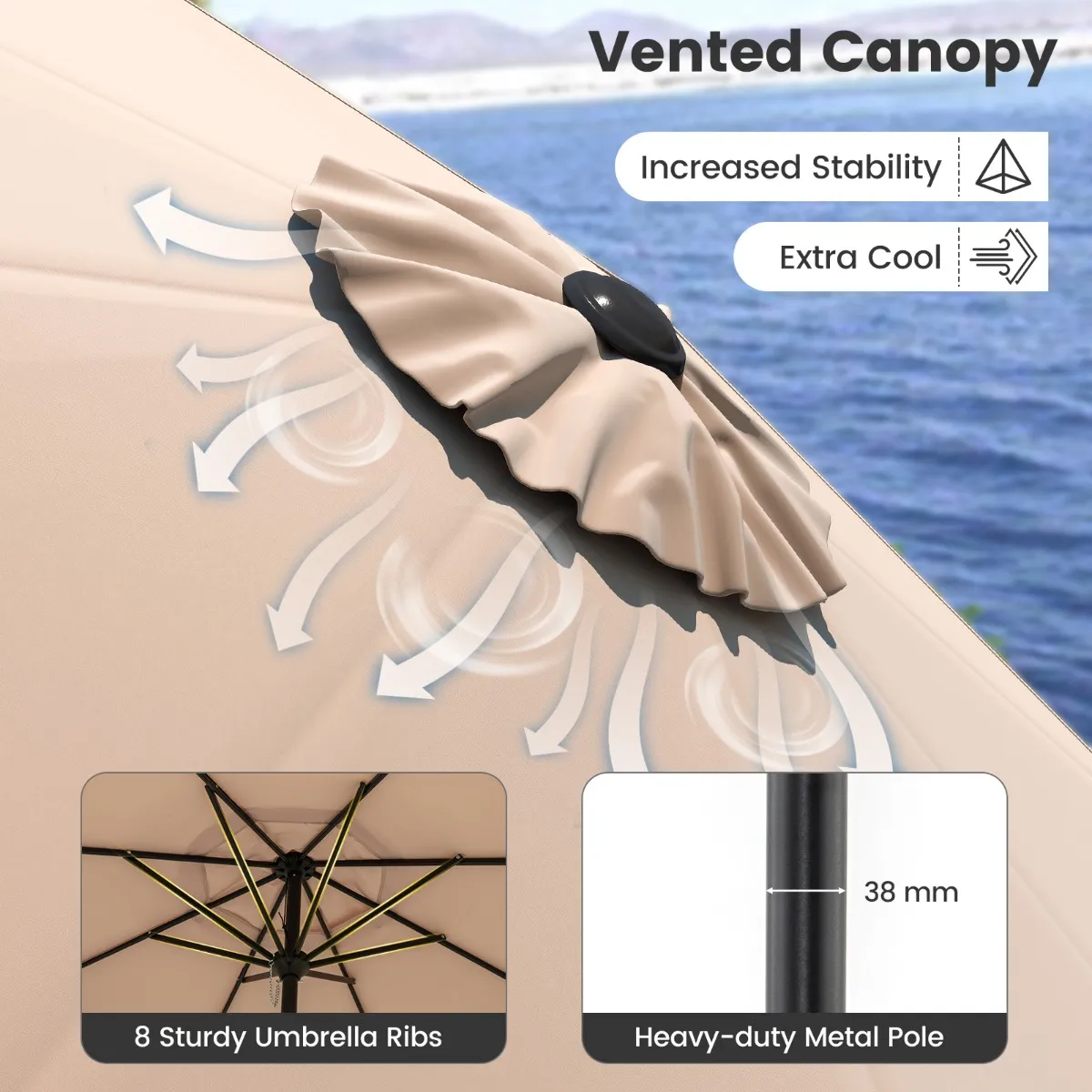Stabiele constructie & geventileerd dak: Het robuuste frame bestaat uit een metalen paal van 38 mm dik en 8 stevige baleinen, wat de stabiliteit van de tuinparasol verhoogt. De ventilatieopening laat lucht circuleren voor een verkoelend effect en extra stabiliteit. Gebruik de parasol met een geschikte verzwaarde voet (niet inbegrepen).