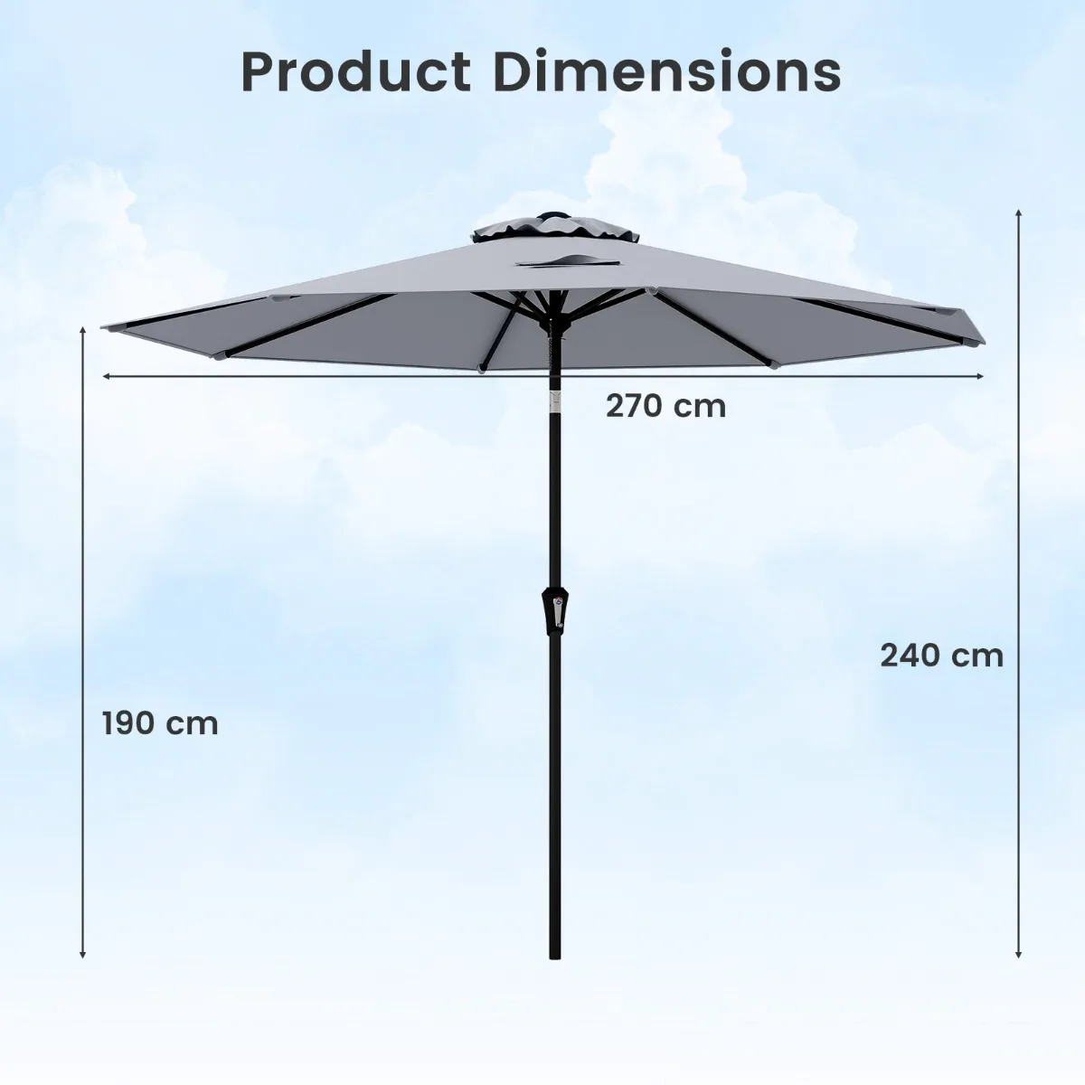 Stabiele constructie & geventileerd dak: Het robuuste frame bestaat uit een metalen paal van 38 mm dik en 8 stevige baleinen, wat de stabiliteit van de tuinparasol verhoogt. De ventilatieopening laat lucht circuleren voor een verkoelend effect en extra stabiliteit. Gebruik de parasol met een geschikte verzwaarde voet (niet inbegrepen).