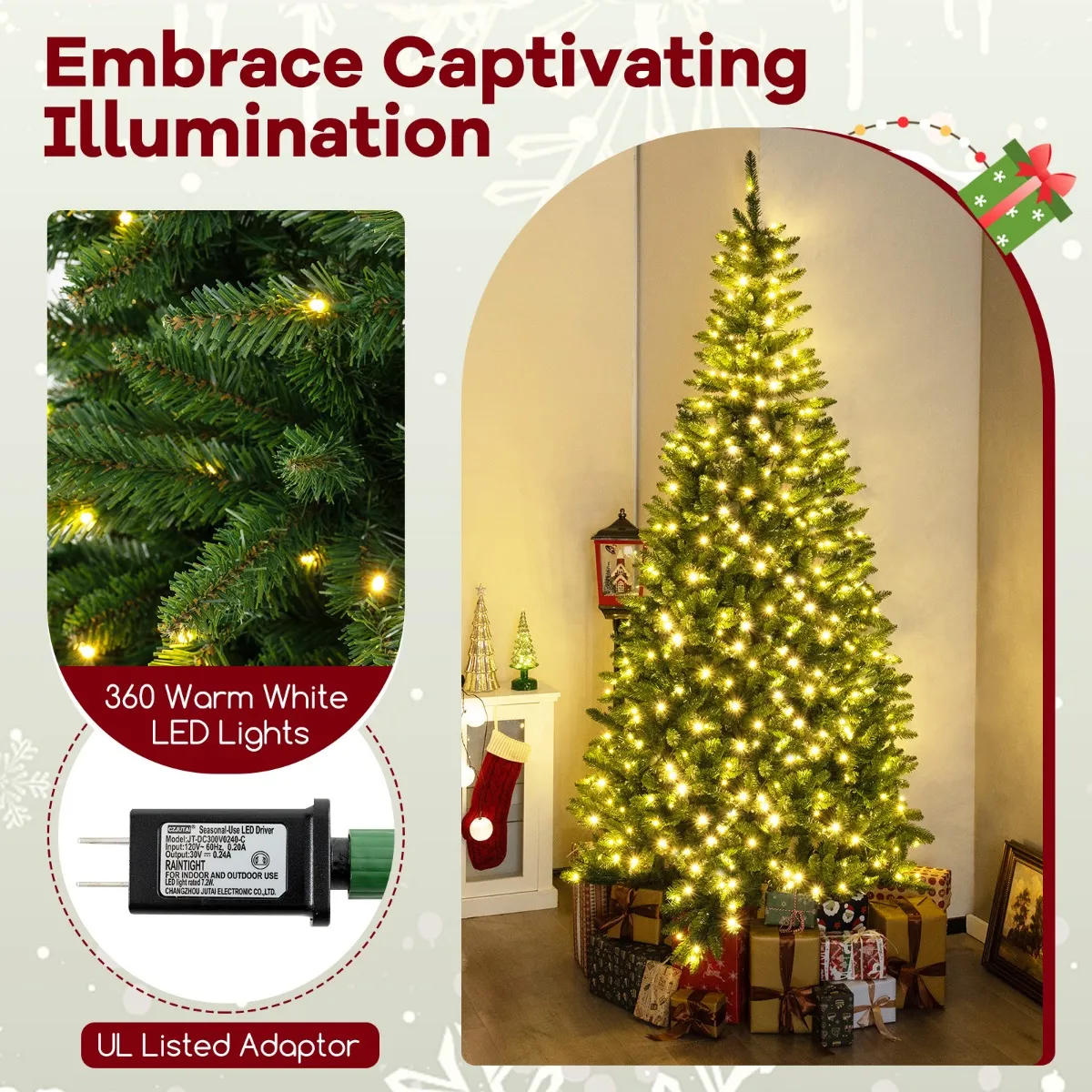 Deze 270° hoekkerstboom is ontworpen voor kleine ruimtes en biedt feestelijke charme zonder al te veel ruimte in te nemen. Met 1137 takuiteinden creëert hij een weelderige look die lijkt op een echte conifeer. Hij is gemaakt van vlamvertragend, niet-allergeen en geurloos PVC en is dus een veilige keuze voor gezinnen met kinderen en huisdieren. De warme gloed van 360 witte LED-lampjes verhoogt de sfeer en dankzij de praktische scharnierende structuur schuiven de takken automatisch uit. Hij is voorzien van een metalen standaard met een voorgeïnstalleerde bout om de stabiliteit te garanderen.