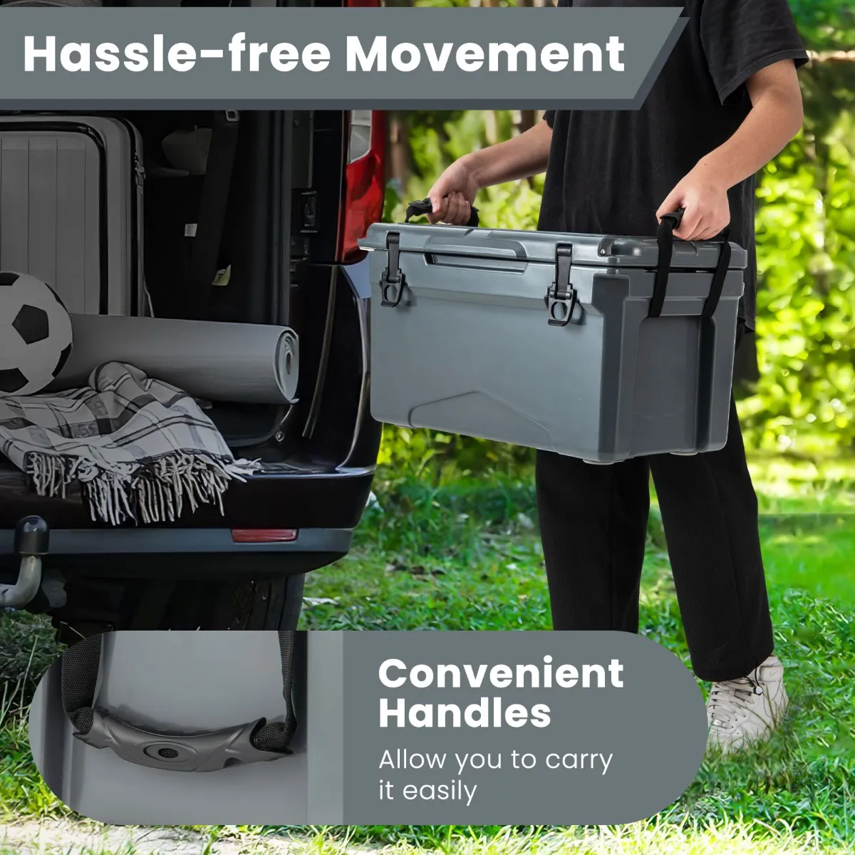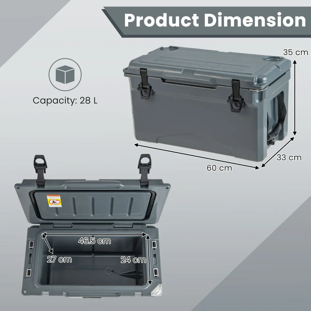 Met kwaliteitsmaterialen en een rotomoulded ontwerp kan deze koelbox 5 tot 7 dagen koud en 2 tot 3 dagen warm houden, afhankelijk van je behoeften. De geïntegreerde flesopener, bekerhouders en visliniaal geven je gemak. Dankzij de stevige nylon handgrepen is hij gemakkelijk te verplaatsen. Dankzij het stevige deksel, dat tot 100 kg kan dragen, kun je hem gebruiken als tafel of stoelverhoger. Met een inhoud van 28 liter is hij ideaal voor kamperen, picknicken of vissen.