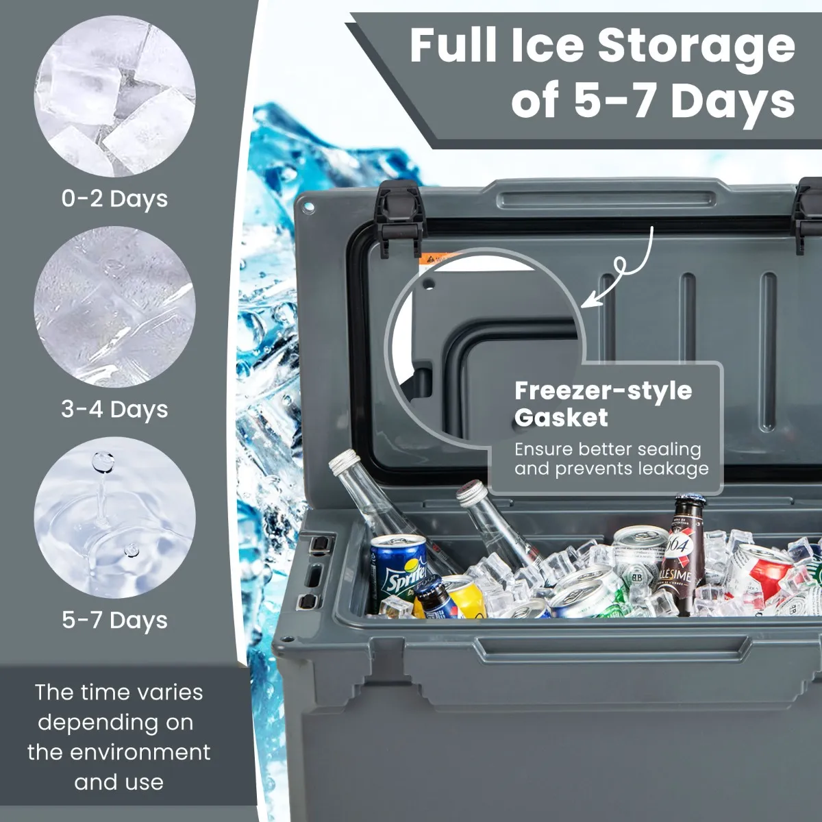 ÂUitstekende isolatie – Met zijn volledig geïsoleerde ontwerp biedt deze rotatiegevormde harde koeler een volledige ijsopslag van 5 – 7 dagen. Zo krijg je een keuze aan koele dranken zoals bieren, dranken en sappen. Zelfs levensmiddelen kunnen de geïsoleerde koelbox 5 – 7 dagen lang vers en 2 – 3 dagen lang warm houden om aan je verschillende behoeften te voldoen.
