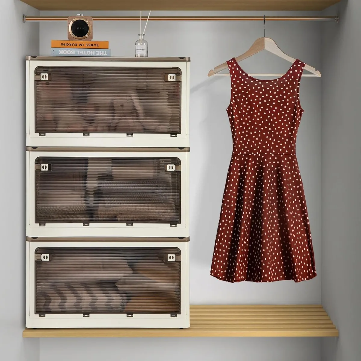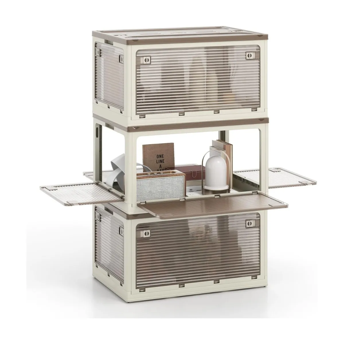 Met veel opbergcapaciteit zijn deze stapelbare opbergbakken perfect voor het opbergen van kleding, speelgoed, boeken, snacks en nog veel meer. Dankzij het ontwerp met 5 openingen kun je je spullen gemakkelijk uit meerdere richtingen pakken. Elke opbergbox is voorzien van wieltjes voor eenvoudige mobiliteit en onafhankelijk gebruik. Opvouwbaar, dus ruimtebesparend en gemakkelijker te installeren. Bovendien bieden ingebouwde opbergvakken voor droogmiddelen of insectenwerende middelen extra bescherming voor je spullen.