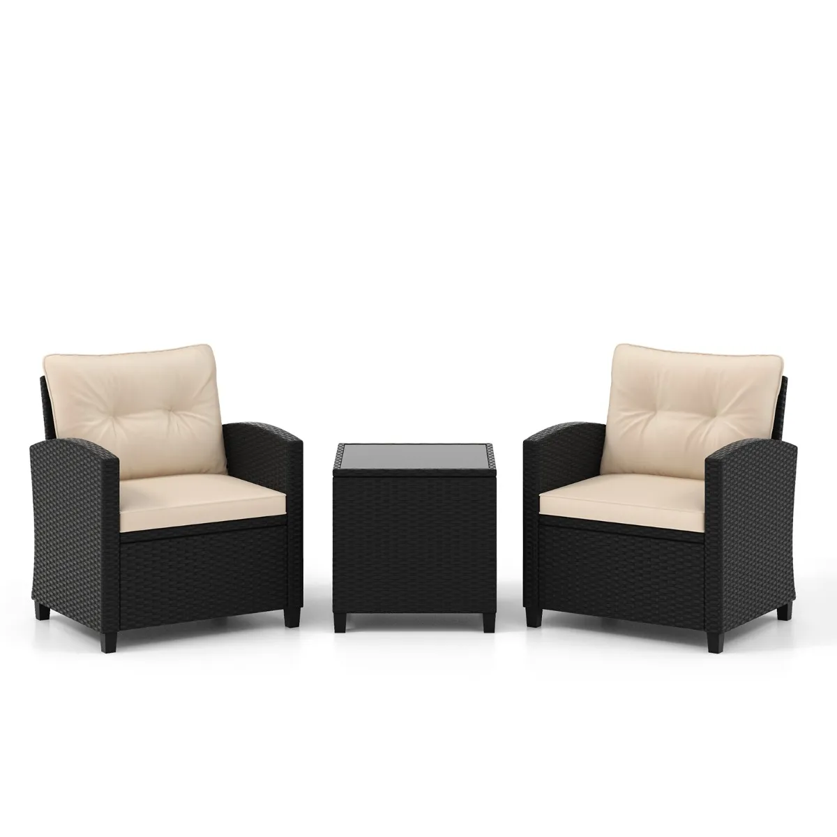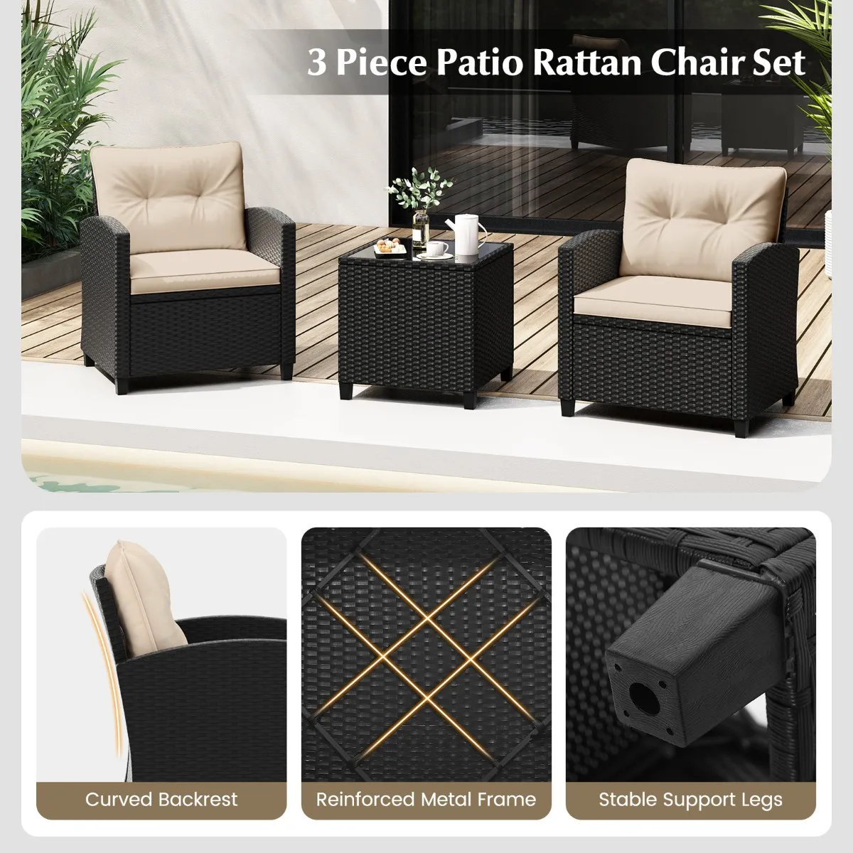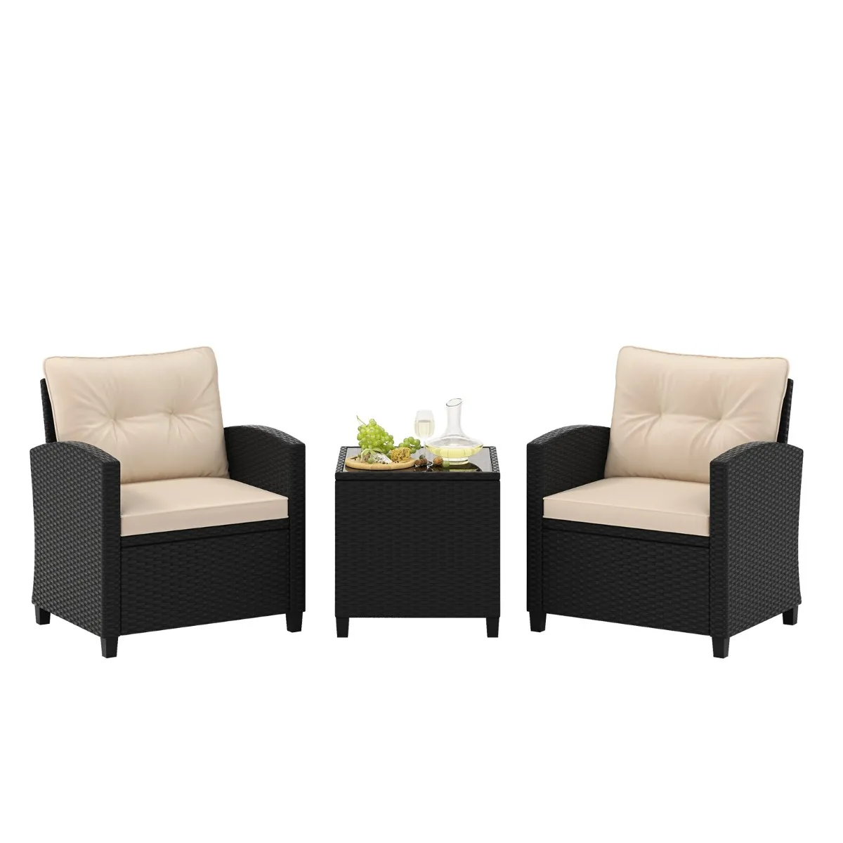 Stijlvol design: Deze 3-delige loungeset is gemaakt van hoogwaardig zwart PE-rotan en geeft elke buitenruimte een natuurlijke, elegante uitstraling. Het strak geweven wicker is weerbestendig en kleurecht voor een langere levensduur. Â