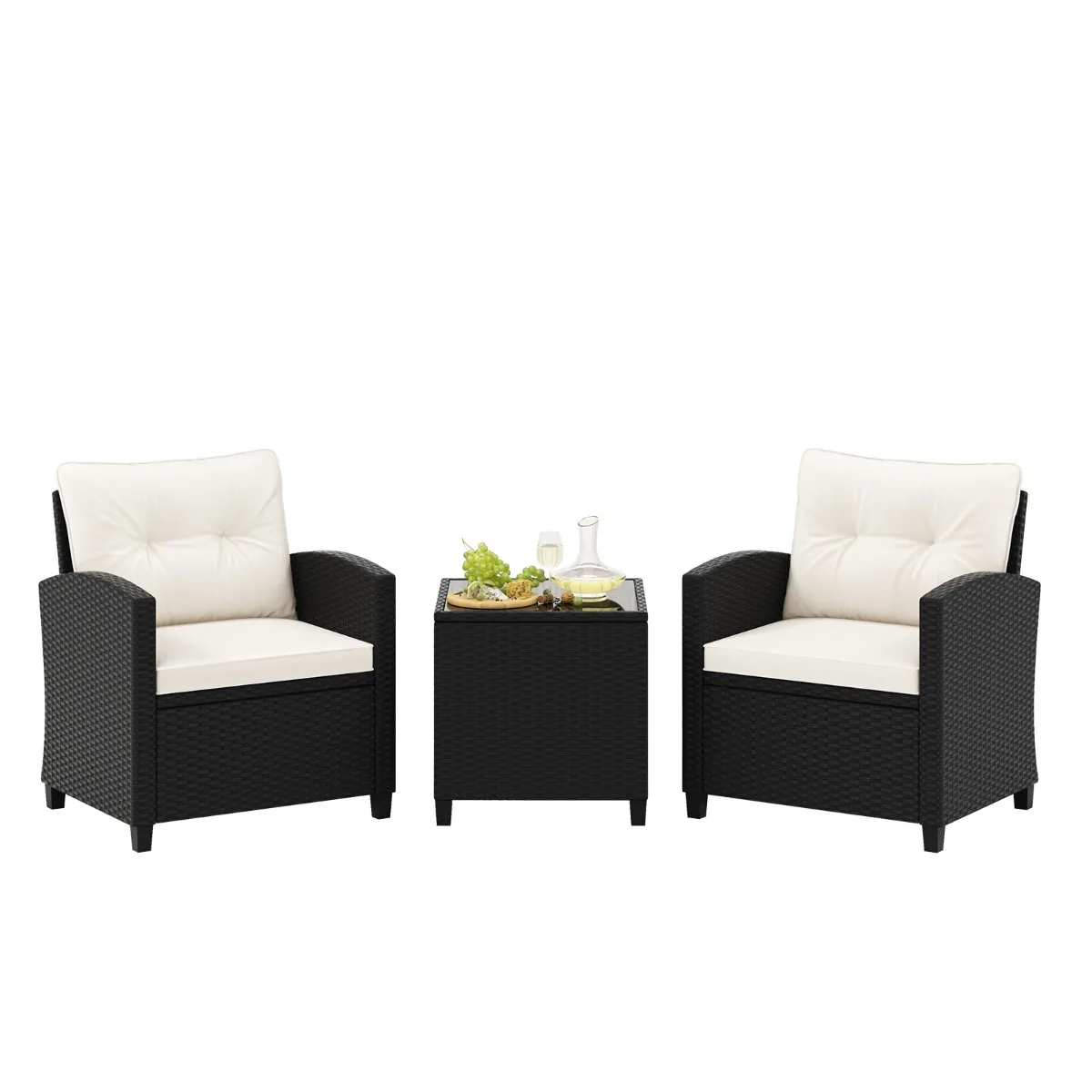Stijlvol design: Deze 3-delige loungeset is gemaakt van hoogwaardig zwart PE-rotan en geeft elke buitenruimte een natuurlijke, elegante uitstraling. Het strak geweven wicker is weerbestendig en kleurecht voor een langere levensduur.