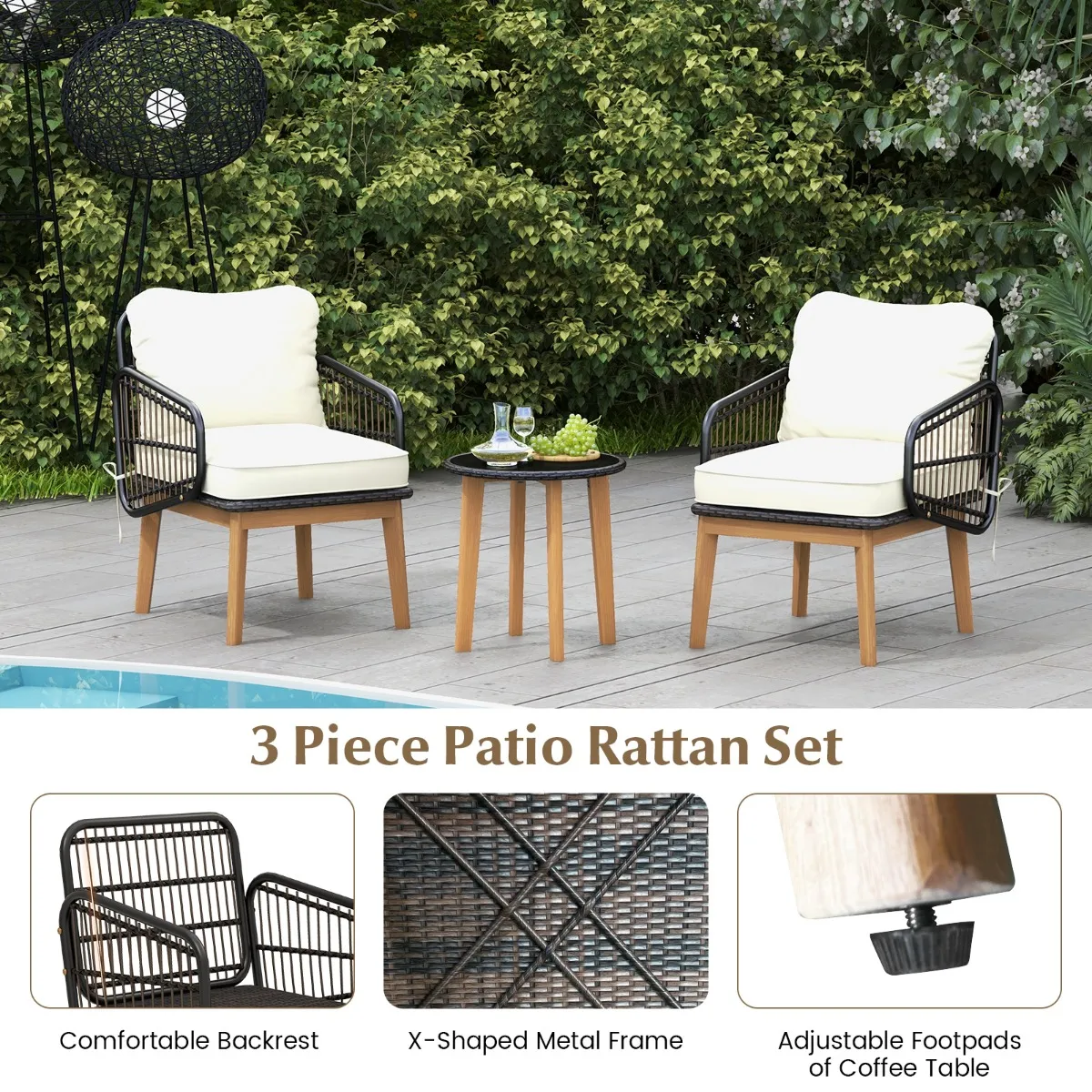 Deze terrasstoelset van rotan combineert stijl en functionaliteit en is daardoor een perfecte aanvulling voor je buitenruimte. De stoelen beschikken over een hoogwaardige bruine PE-rotan zitting, die lichtbestendig is en voor langdurige schoonheid zorgt. De comfortabele rugleuning biedt een sterke grip, terwijl de gezellige zit- en rugkussens ongeëvenaard comfort bieden. Het frame van massief acaciahout en het X-vormige metalen frame onder de zitting zorgen voor hoge sterkte en stabiliteit. Bovendien is de praktische bijzettafel met een tafelblad van gehard glas perfect geschikt voor het neerzetten van dranken en snacks.