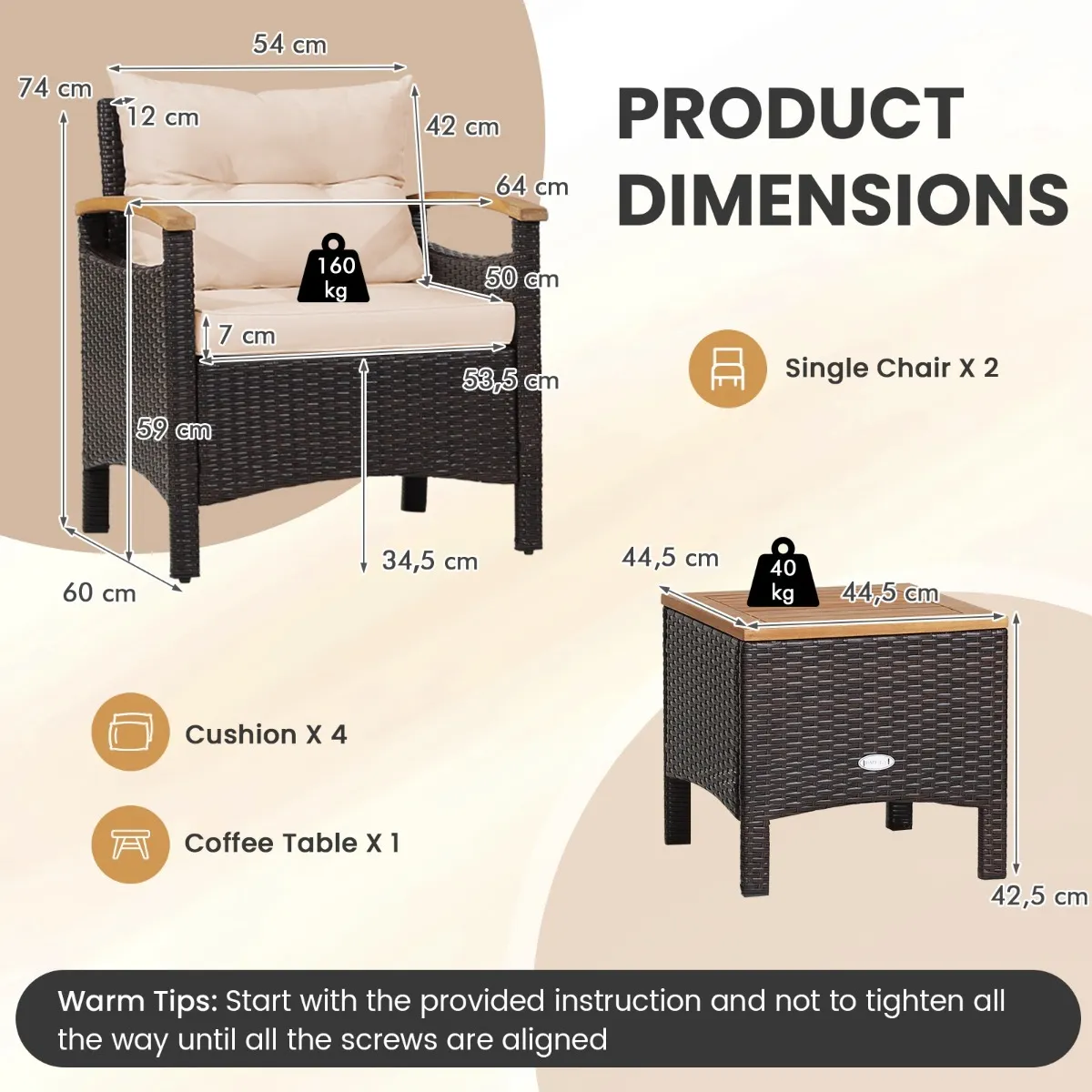 Rieten meubelset : Het oppervlak van deze patioset is gemaakt van duurzaam bruin PE rotan, dat slijtvast is voor langdurig buitengebruik. Het stevige metalen frame met poedercoating is roestbestendig en robuust en biedt een sterke ondersteuning tot 160 kg per stoel.