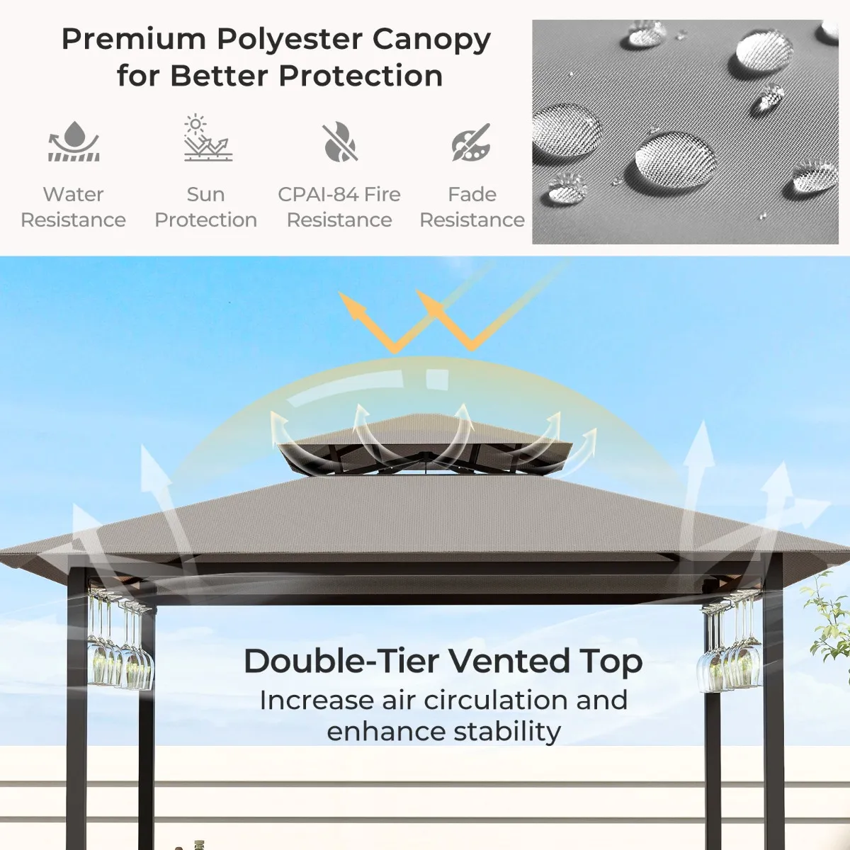 Onze 3-delige terrasbarset bevat een stijlvol grillpaviljoen, 2 ergonomische barkrukken en een multifunctionele bartafel, perfect voor elke achtertuin, tuin of zwembad. De set is op maat gemaakt voor comfort en gemak en bestaat uit een stevig tuinpaviljoen met een gepoedercoat metalen frame en een vlamvertragend polyester dak ter bescherming tegen zon en wind. Bovendien is de bartafel voorzien van een hittebestendig blad van gehard glas voor het serveren van drankjes en is hij uitgerust met planken en glashouders om uw benodigdheden binnen handbereik te houden. Last but not least zijn de barkrukken ergonomisch ontworpen en voorzien van U-vormige zittingen en mesh voetsteunen, perfect voor lange gesprekken en ontspannen. Deze set is niet alleen een functionele aanvulling, maar verfraait met zijn harmonieuze en elegante uitstraling ook uw buitendecoratie.