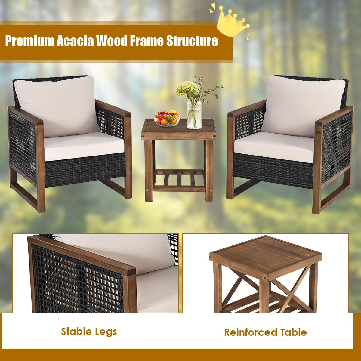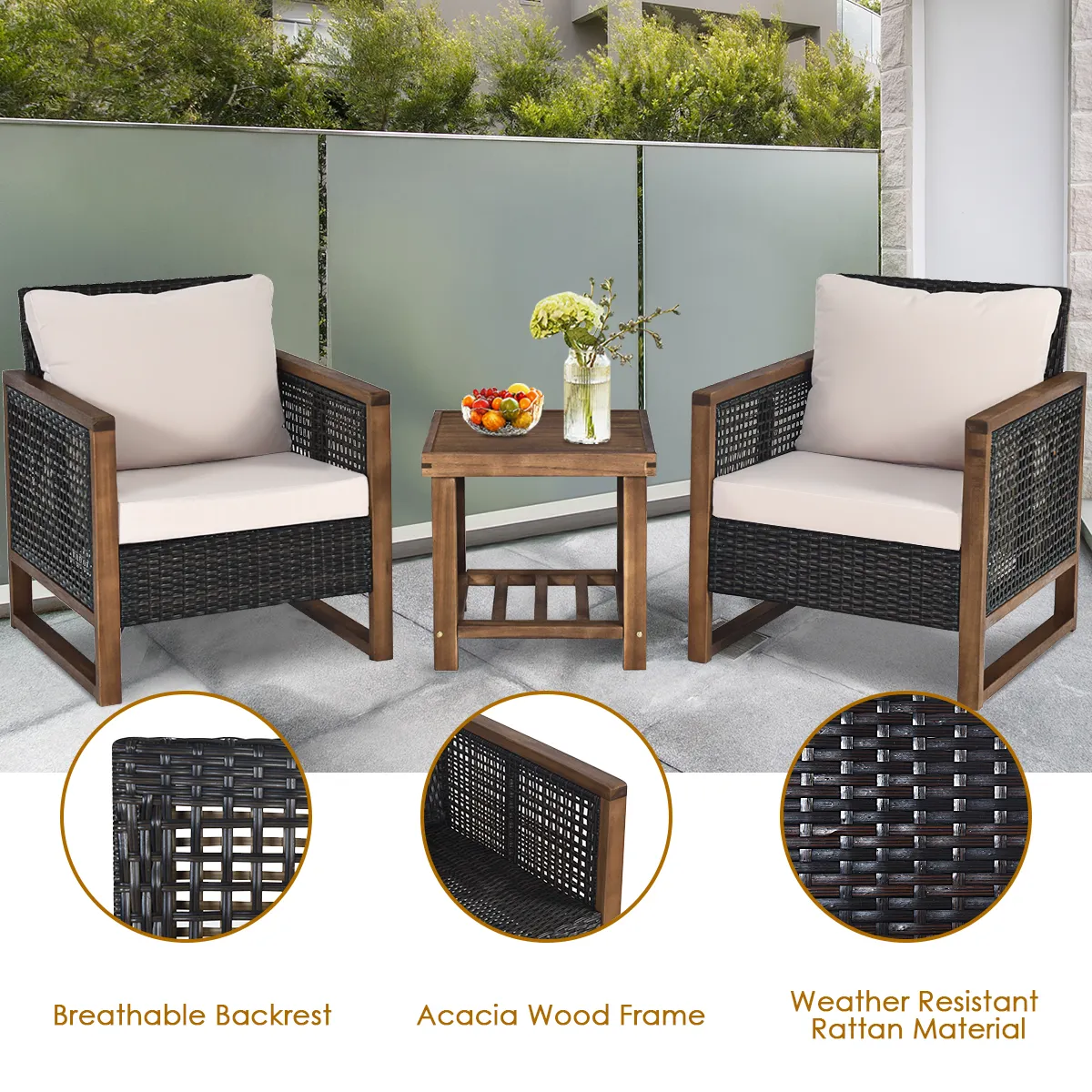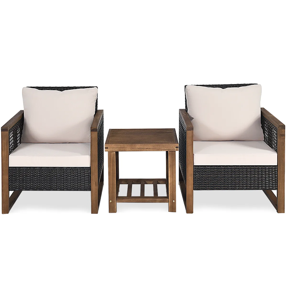 Onze 3-delige PE Rotan meubelset zal een ideale keuze zijn voor u en uw familie om te ontspannen op verschillende plaatsen, zoals de tuin, patio, veranda en zwembad. Hij bestaat uit een acaciahouten salontafel en 2 PE rotan stoelen. De salontafel met 2 planken kan indien nodig verschillende voorwerpen bevatten. U kunt hem gebruiken als bijzettafel. De stoelen zijn ontworpen met een ademende rugleuning en ergonomische armleuningen. Daarnaast zorgen de zachte kussens voor veel comfort. Gemaakt van PE rotan en topkwaliteit acaciahout, garandeert onze set een lange levensduur en een uitstekende robuustheid.