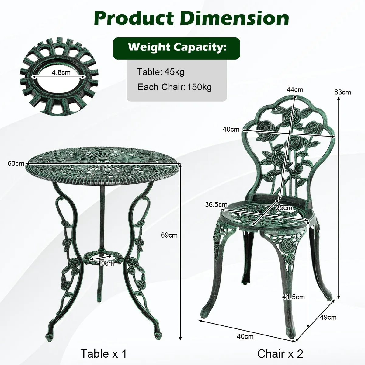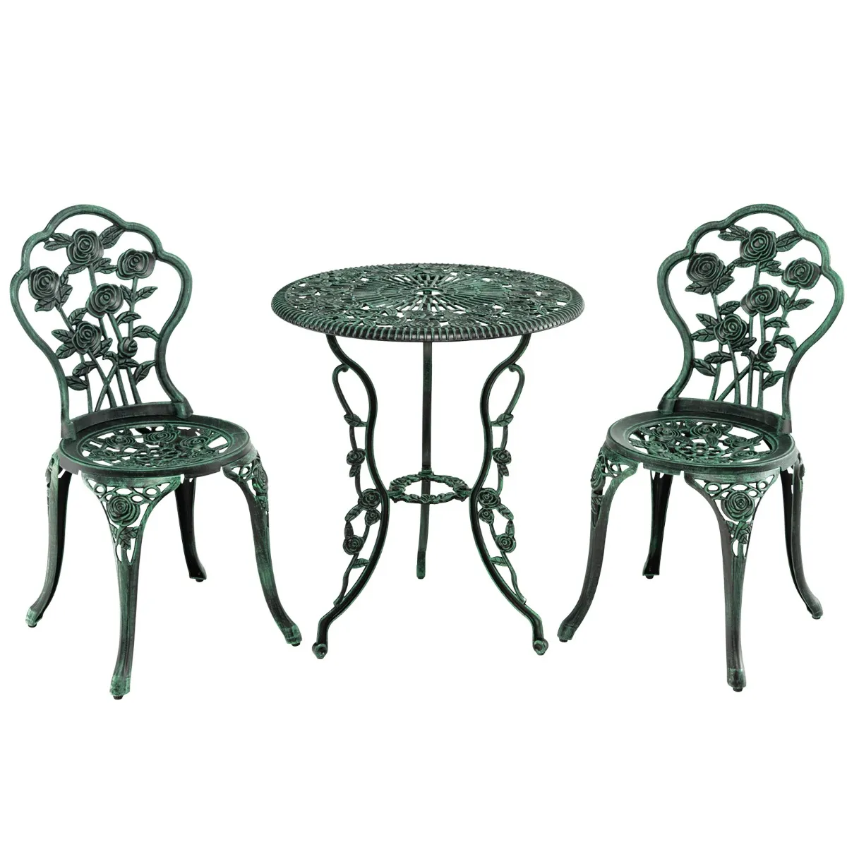 Bistro sets zijn perfect voor elke kleine ruimte of om een grotere ruimte te accentueren. En het biedt u een rustige, gezellige ruimte buiten om een gesprek te voeren, een boek te lezen, ’s ochtends te genieten van een kopje koffie of wat u maar wilt. Gemaakt van roestvrij gegoten aluminium, die ervoor zorgen dat de set het hele jaar door kan blijven staan. Het hoogtepunt van deze bistro tafelset is het antieke exquise uiterlijk. Deze bistroset is het beste decor voor uw tuin en geeft uw gast een diepe indruk. Het is ook veelzijdig, voeg gewoon wat kussens toe om kleur en patroon toe te voegen, of u kunt dit buiten terras meubilair mixen en matchen met andere stukken uit de collectie. Tuin ronde tafel uitgerust met een paraplu gat, dit kan gebruikt worden met een paraplu voor zonnedek en regen bescherming. Dan kunt u genieten van uw vrije tijd of het nu zonnig en regenachtig is. Dus, koop het nu, het zou u nooit in de steek laten.