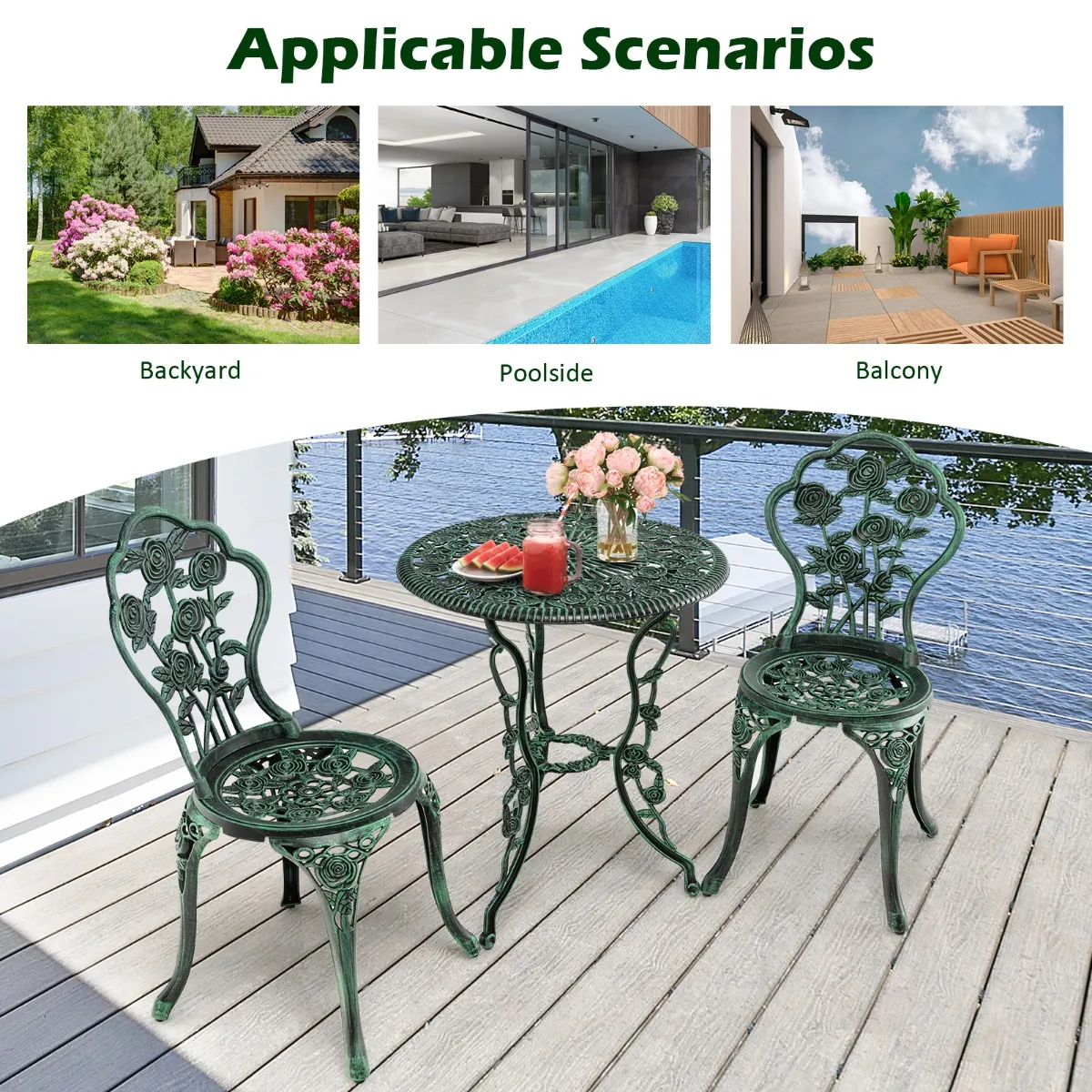 【Solide gegoten aluminium constructie】Door de constructie met gegoten aluminium is deze 3-delige bistroset duurzaam en stevig genoeg om u een lange tijd van dienst te zijn. Daarnaast is de tafel en stoelen in combinatie met het unieke ontwerp van de poten en het stevige materiaal uitgerust met een krachtigere gewichts capaciteit om te ondersteunen.