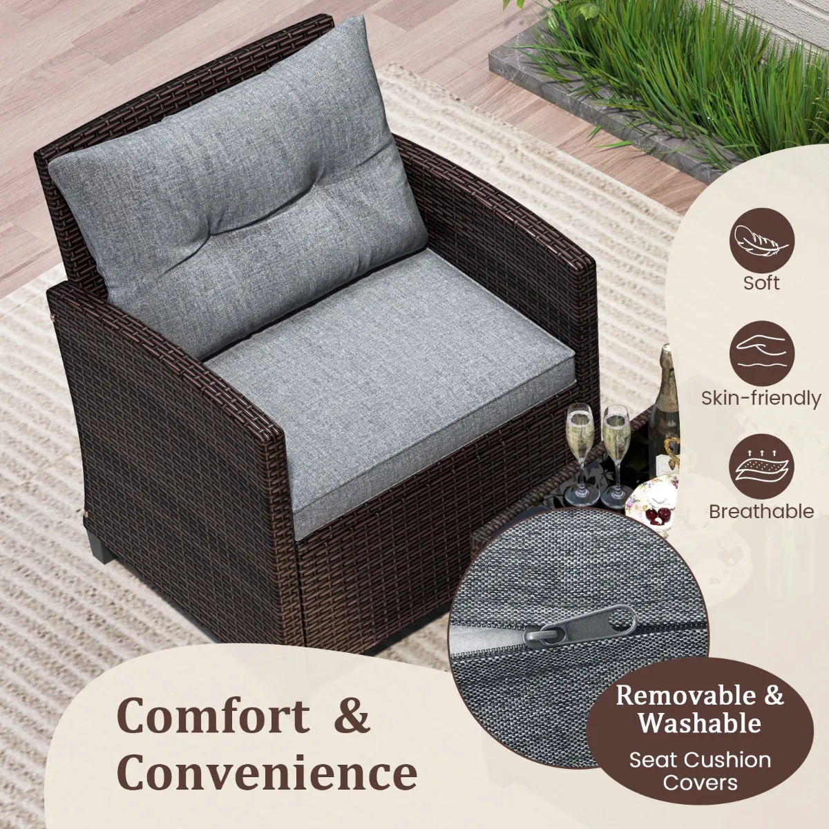 Geniet van een heerlijke koffiepauze of gezellige gesprekken met vrienden met deze luxe 3-delige rotan tuinset! Het elegante en tijdloze ontwerp past perfect in elke buitenruimte en biedt optimaal comfort. De weerbestendige rotan afwerking zorgt voor een lange levensduur, terwijl de zachte kussens een ontspannen zithouding garanderen. Of je nu gasten ontvangt of gewoon even wilt ontspannen, deze tuinset is een stijlvolle en functionele toevoeging aan je buitenruimte. Â