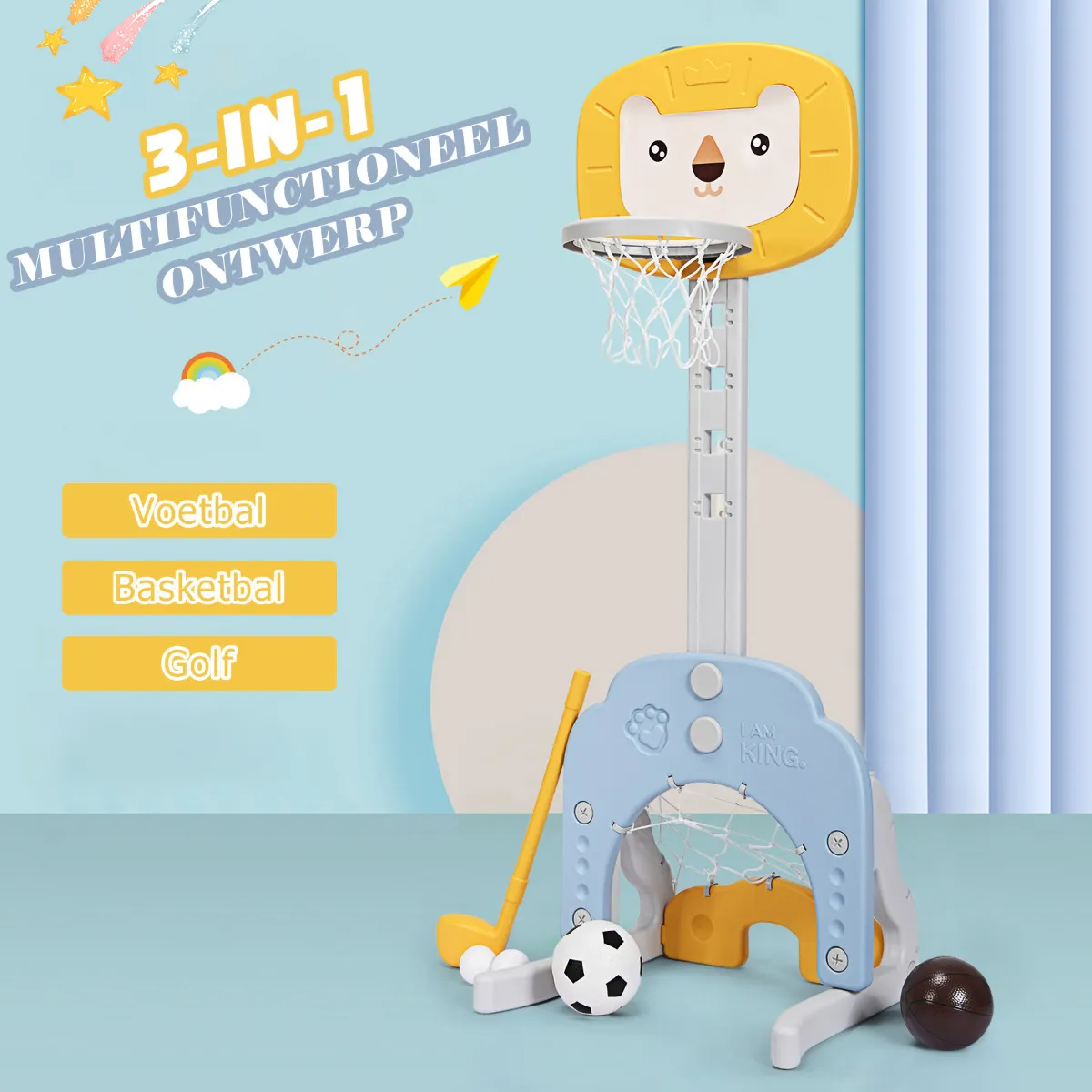 3-in-1 peuterbasketbalhoepel omvat golfspel, basketbalspel en voetbaldoelspel. Kinderen kunnen nooit een spelletje spelen, maar ze kunnen ook bij hun eigen gezin wonen, en ook genieten van de voordelen van de realisatie van onze basketbalhoepel.
