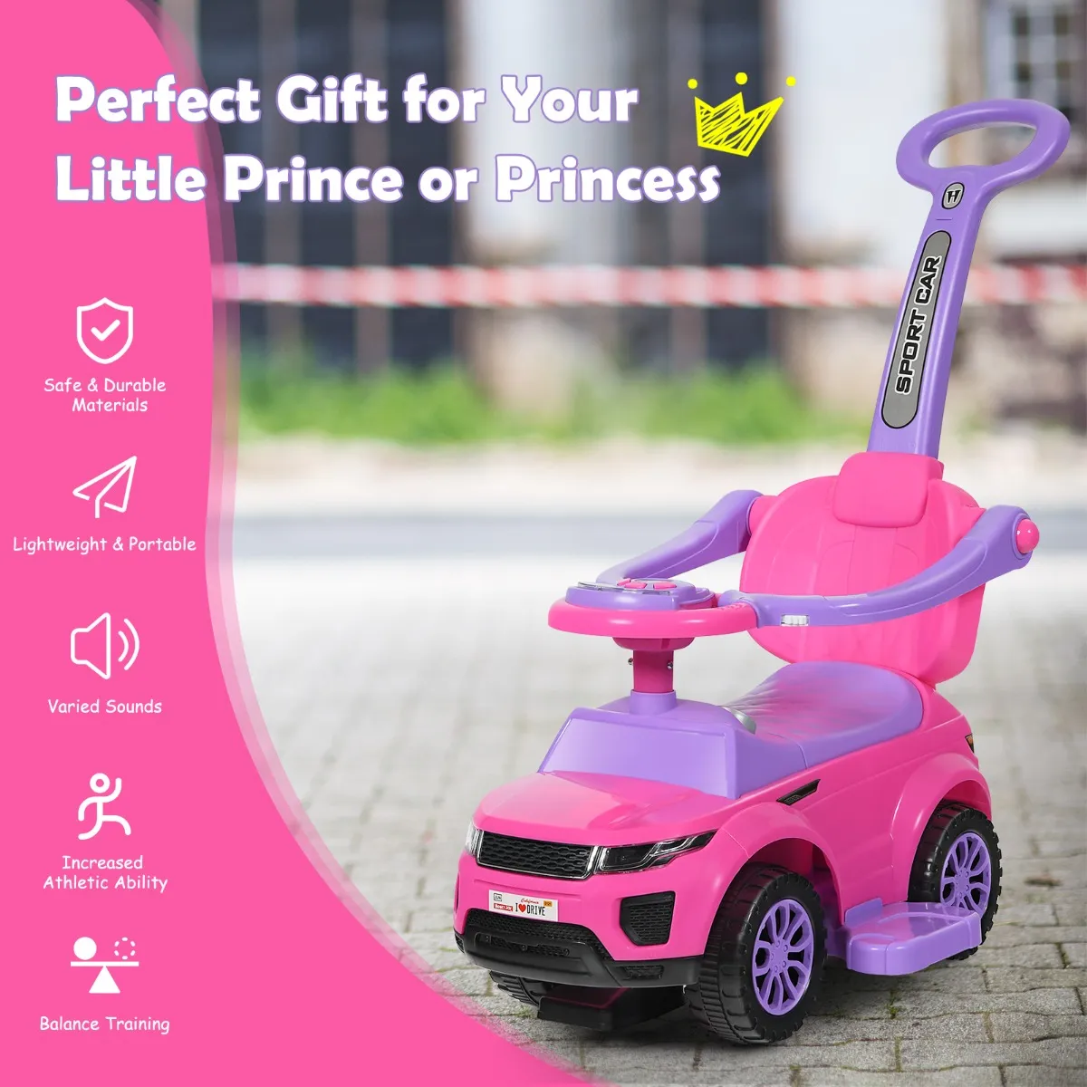 Dit speelgoed combineert kinderwagen-, loop- en meerijdfuncties voor eenvoudig duwen, trekken en glijden. Je engeltje kan de auto zelf laten glijden, of je kunt de auto besturen met een afneembare duwstang. De slijtvaste wielen, veiligheidshekjes en anti-valplank bieden genoeg bescherming om kinderen veilig te laten rijden. Als kinderen klein speelgoed, snacks of andere spullen willen meenemen, zal de verborgen opbergruimte onder de zitting perfect aan hun behoeften voldoen. Waar wacht je nog op?