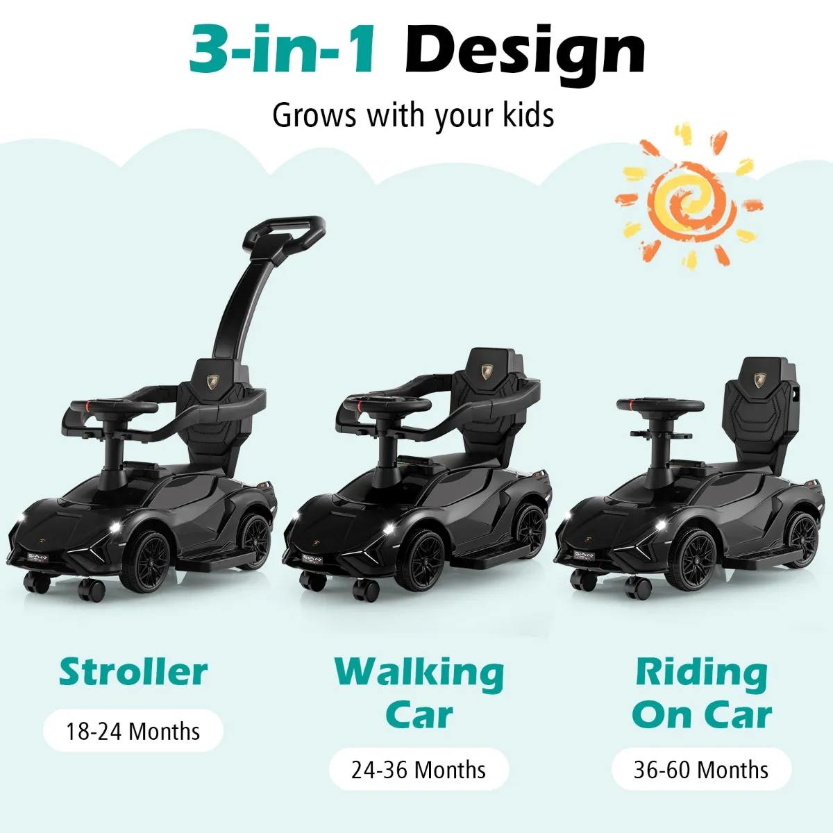 【Kindvriendelijk 3-in-1 ontwerp】: Deze auto met Lamborghini-licentie is eenvoudig te schakelen tussen een kinderwagen (voor kinderen van 18 tot 24 maanden), loopauto (voor kinderen van 24 tot 36 maanden) en rijdende auto (voor kinderen van 36 tot 60 maanden). Hij is uitgerust met afneembare relingen en een afneembare duwbeugel om de veiligheid van de kinderen te beschermen.