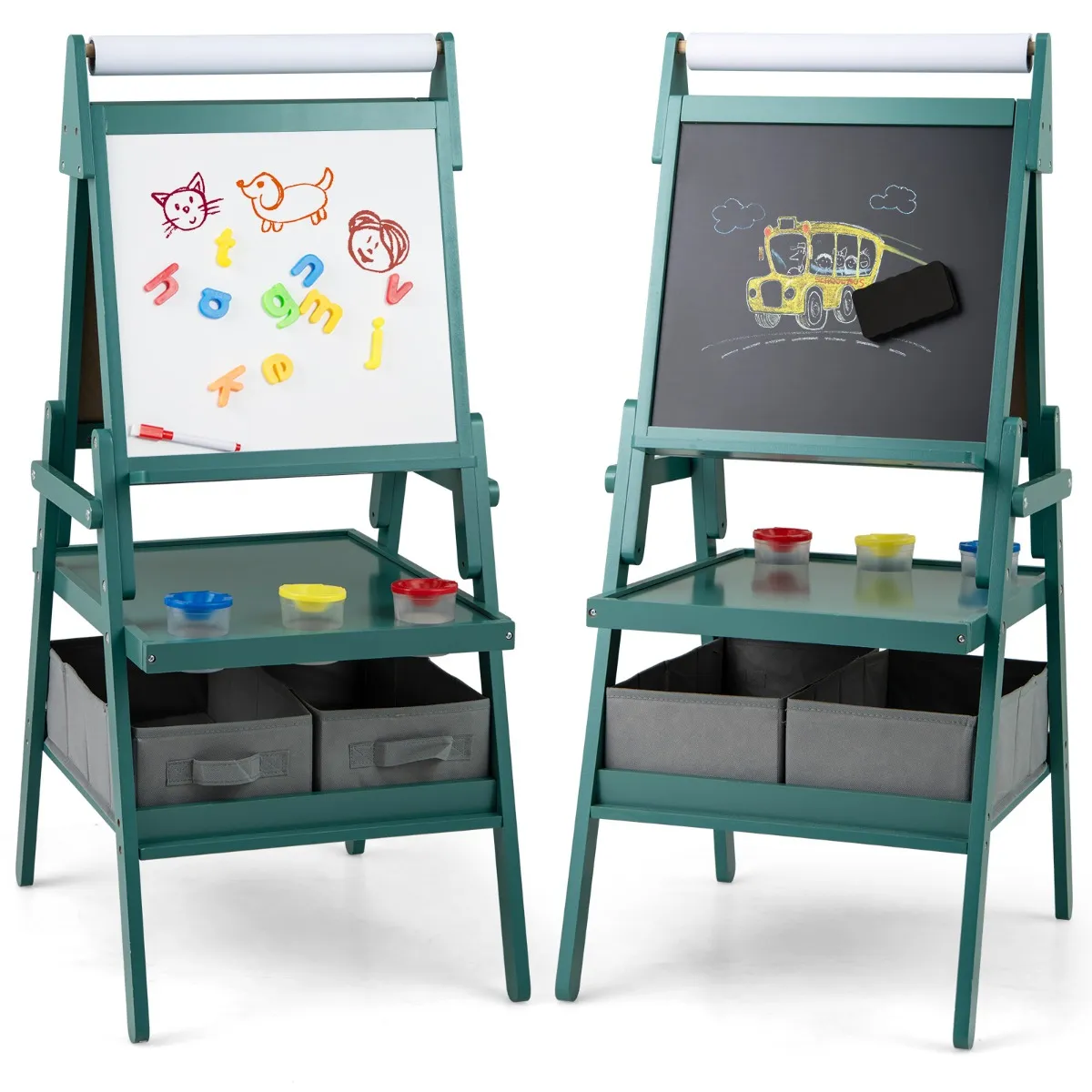 3-In-1 Kinderezel Dubbelzijdige Staande Ezel Met Schoolbord En Whiteboard Papierrol 3 Potten Verf En 2 Opbergbakken Voor Kinderen-Groen