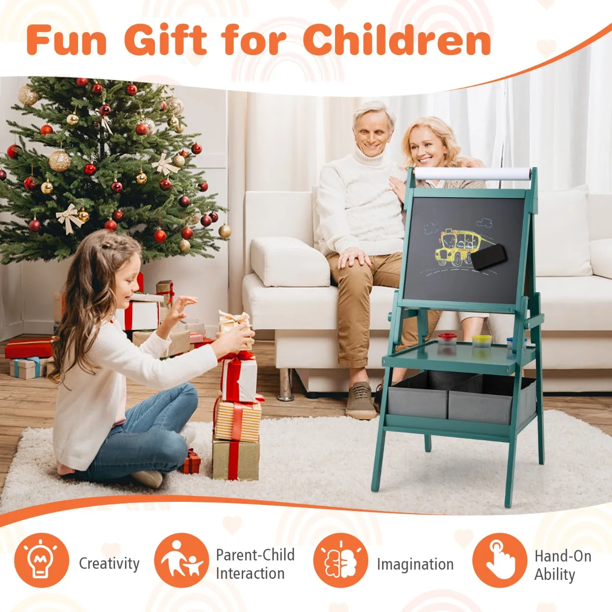 Deze dubbelzijdige ezel is het perfecte cadeau voor jongens en meisjes van 3 tot 6 jaar, waarmee ze hun teken- en schrijfvaardigheid kunnen ontwikkelen. Het heeft een schoolbord, een whiteboard en een rol verwisselbaar papier zodat kinderen samen met hun vriendjes kunnen tekenen. De magnetische zwarte en witte borden maken het ook gemakkelijk om letters, cijfers en vormen te bevestigen voor leuke educatieve activiteiten. Bovendien houdt de grote lade met 3 verfpotten de kwasten netjes opgeborgen. De 2 kleine gereedschapsbakjes en 2 stoffen bakken kunnen kunstaccessoires en speelgoed opbergen.