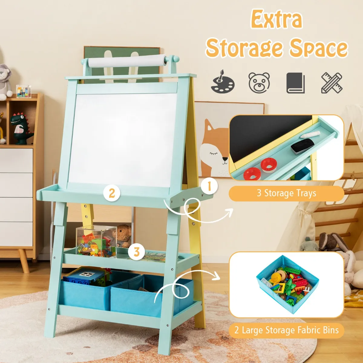 Op het magnetische whiteboard en het krijtbord kunnen kleine kunstenaars samen met hun beste vrienden schilderen en zo hun vriendschap verdiepen. De bovenaan bevestigde papierrol biedt bovendien een extra tekenoppervlak voor andere kunstwerken. De twee legplanken, die zich onder het whiteboard en het bord bevinden, bieden veel ruimte voor schilderaccessoires, die altijd snel bereikbaar zijn. De twee onderste planken bieden extra opbergruimte en dankzij de twee opbergdozen veel ruimte voor het organiseren van de kunstaccessoires. Geef je kinderen met deze ezel de mogelijkheid om hun creativiteit en fantasie te ontdekken en verder te ontwikkelen.
