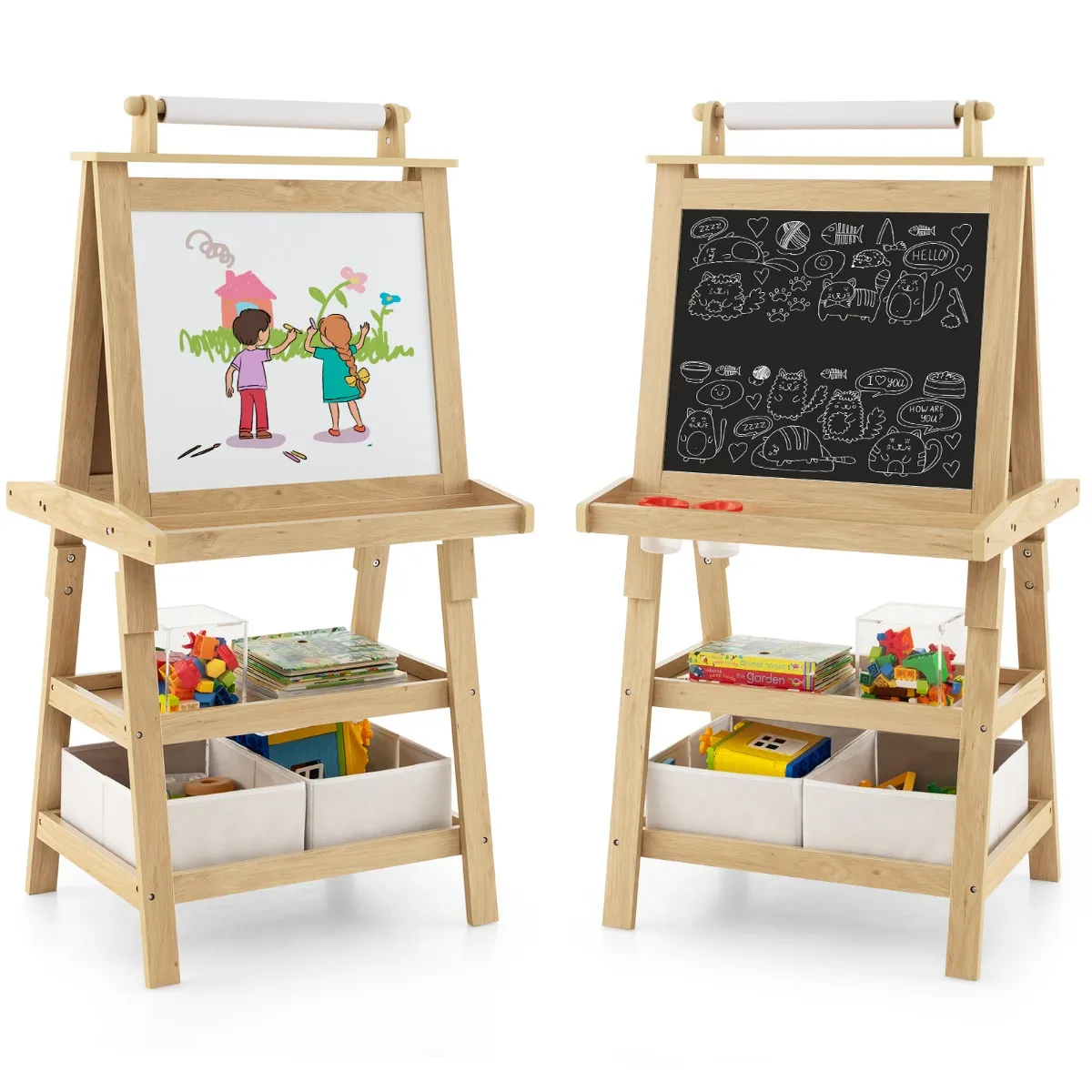 Op het magnetische whiteboard en het krijtbord kunnen kleine kunstenaars samen met hun beste vrienden schilderen en zo hun vriendschap verdiepen. De bovenaan bevestigde papierrol biedt bovendien een extra tekenoppervlak voor andere kunstwerken. De twee legplanken, die zich onder het whiteboard en het bord bevinden, bieden veel ruimte voor schilderaccessoires, die altijd snel bereikbaar zijn. De twee onderste planken bieden extra opbergruimte en dankzij de twee opbergdozen veel ruimte voor het organiseren van de kunstaccessoires. Geef je kinderen met deze ezel de mogelijkheid om hun creativiteit en fantasie te ontdekken en verder te ontwikkelen.
